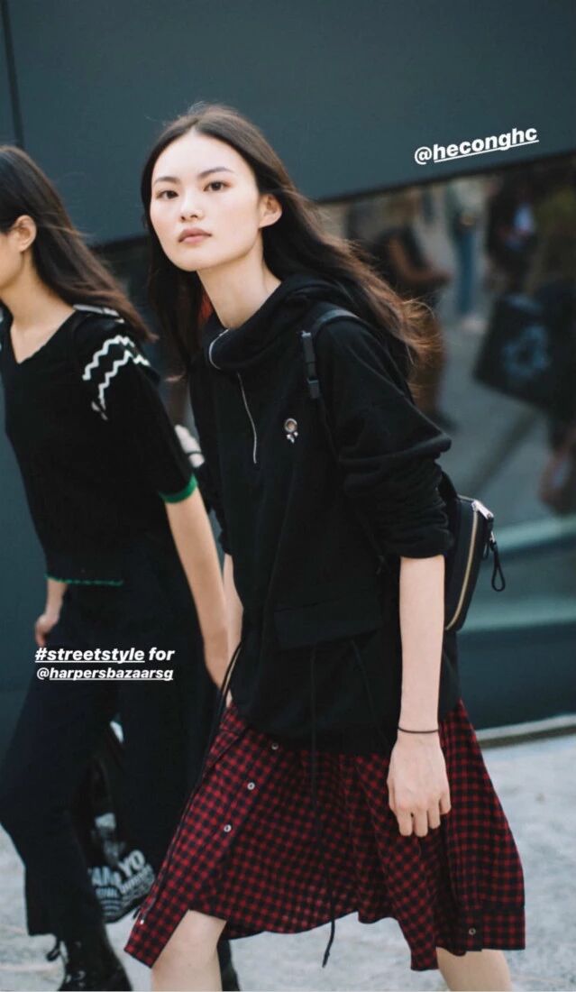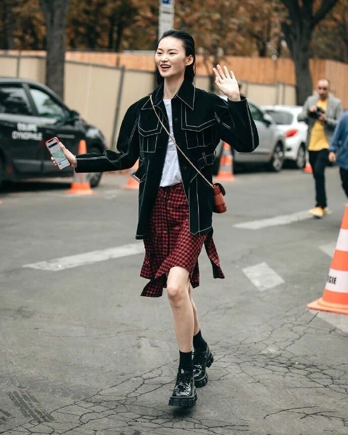 同一件单品给到贺聪,使用率可以说是翻倍的。不规则的格纹半裙刚刚搭配完卫衣,过几天又换成白T恤加黑色夹克的造型,同样青春无敌也多了几分时髦感,超级适合周末约闺蜜逛街穿着。