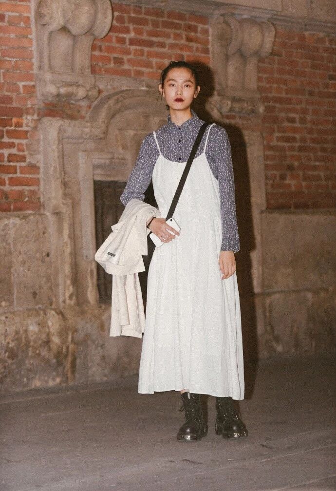 在米兰街头留下倩影的佳丽同学,选择了略带少女感的吊带白裙搭配了碎花衬衫,酷感的马丁靴平衡了整体造型不至于太过“淑女”。就连手机壳配色也是搭的哦~