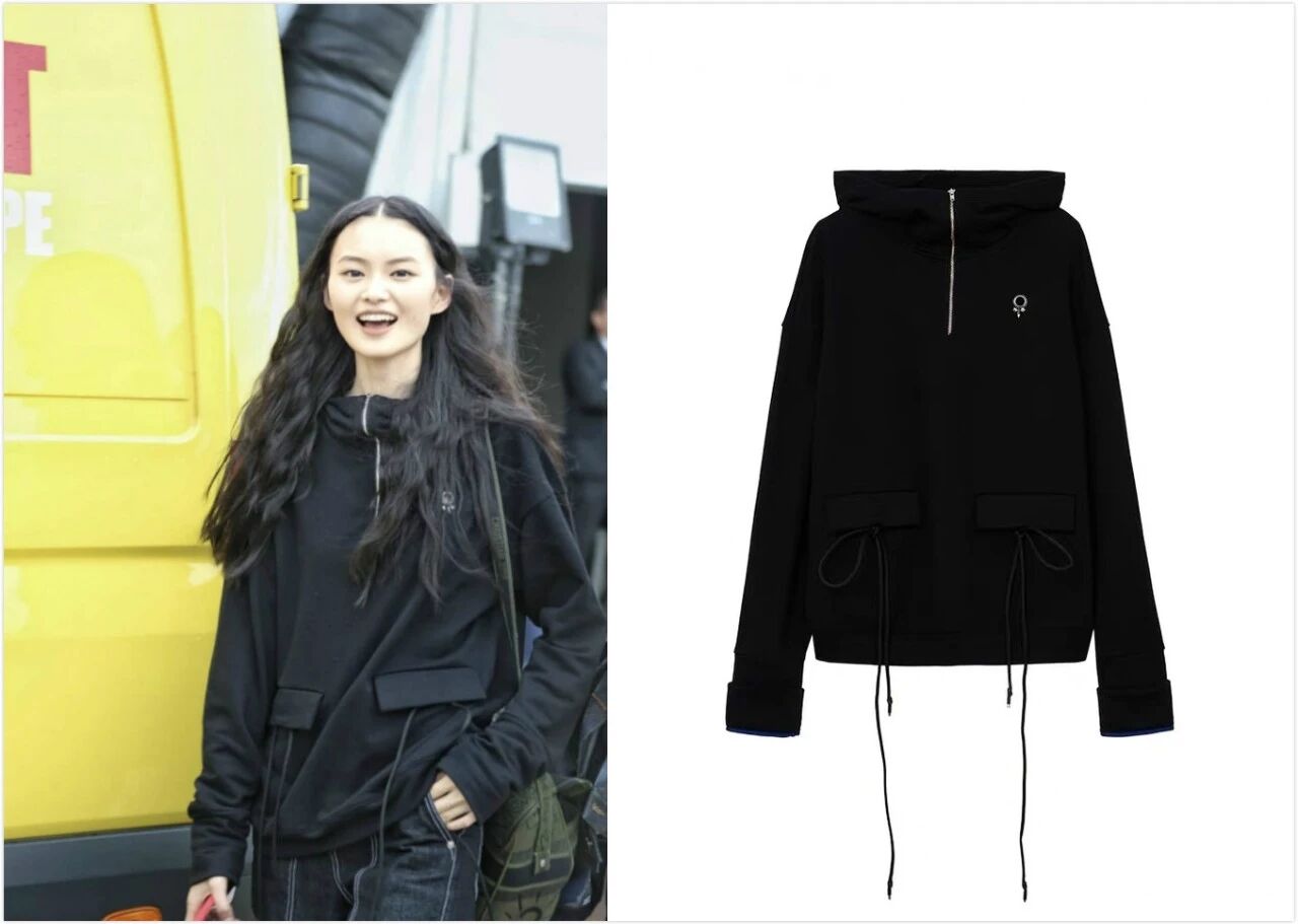 一身黑的造型乍看上去有些偷懒,但是少女爱美的小心思藏也藏不住,黑色连帽衫的双拉链设计别具巧思,紫色的袜子瞬间打破了整体黑色带来的沉闷感~