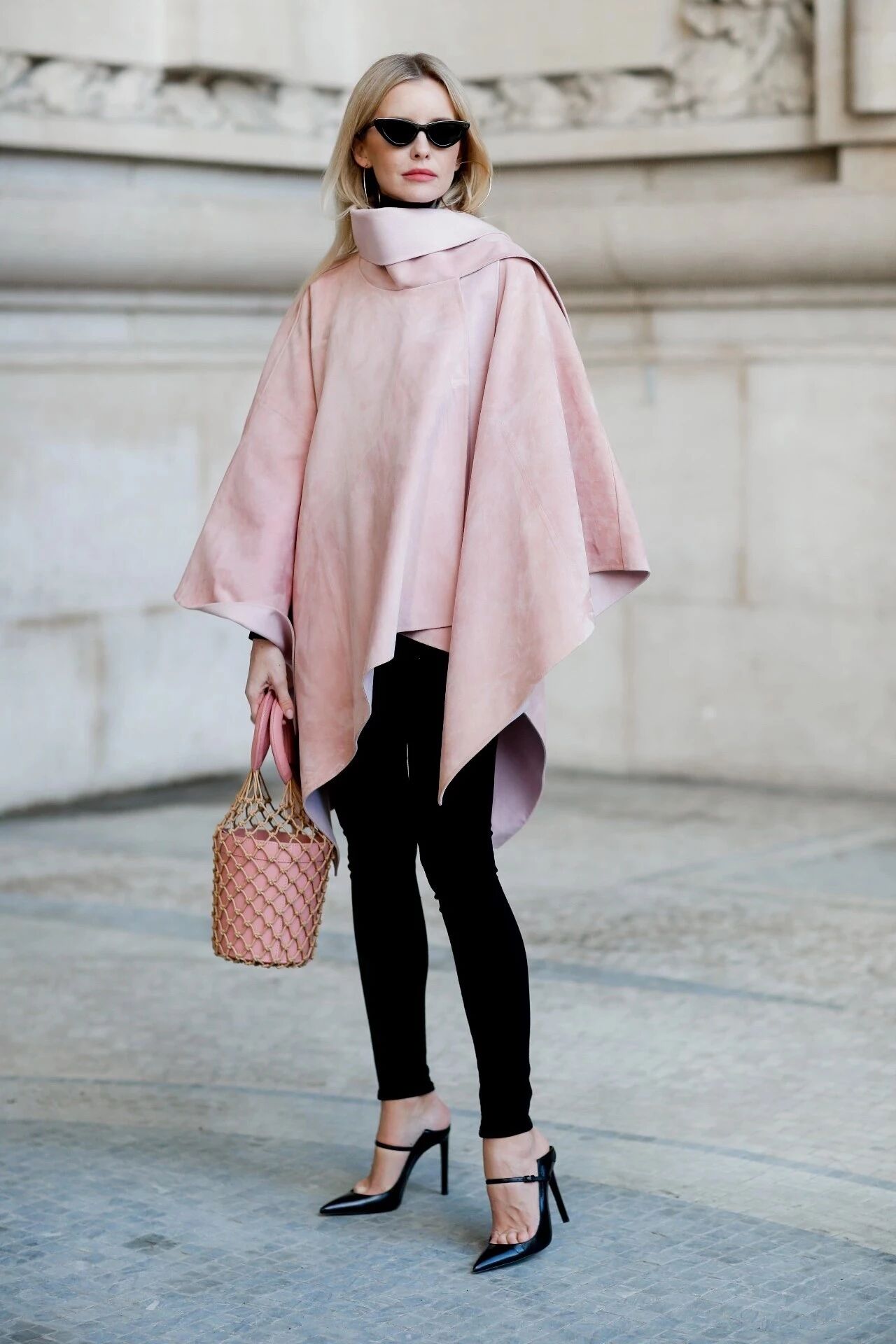 粉色的围巾式大斗篷又宽又长,黑色的打底裤非常显瘦,秀长腿的气质穿搭,只要简单地套上一双高跟就可以出门,不仅年轻还很时髦。