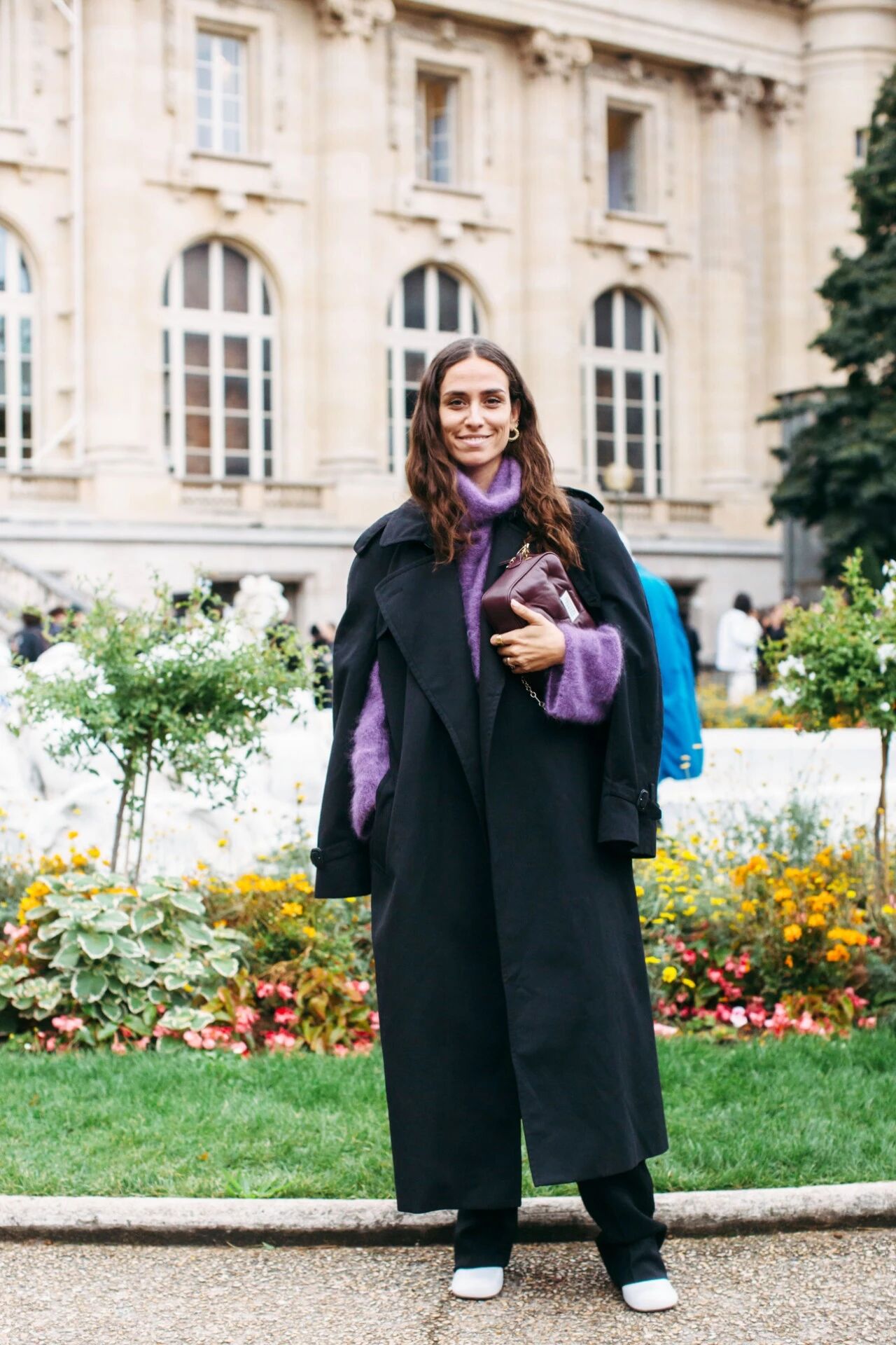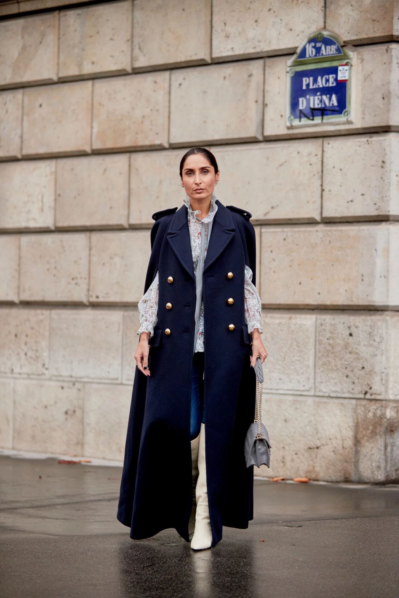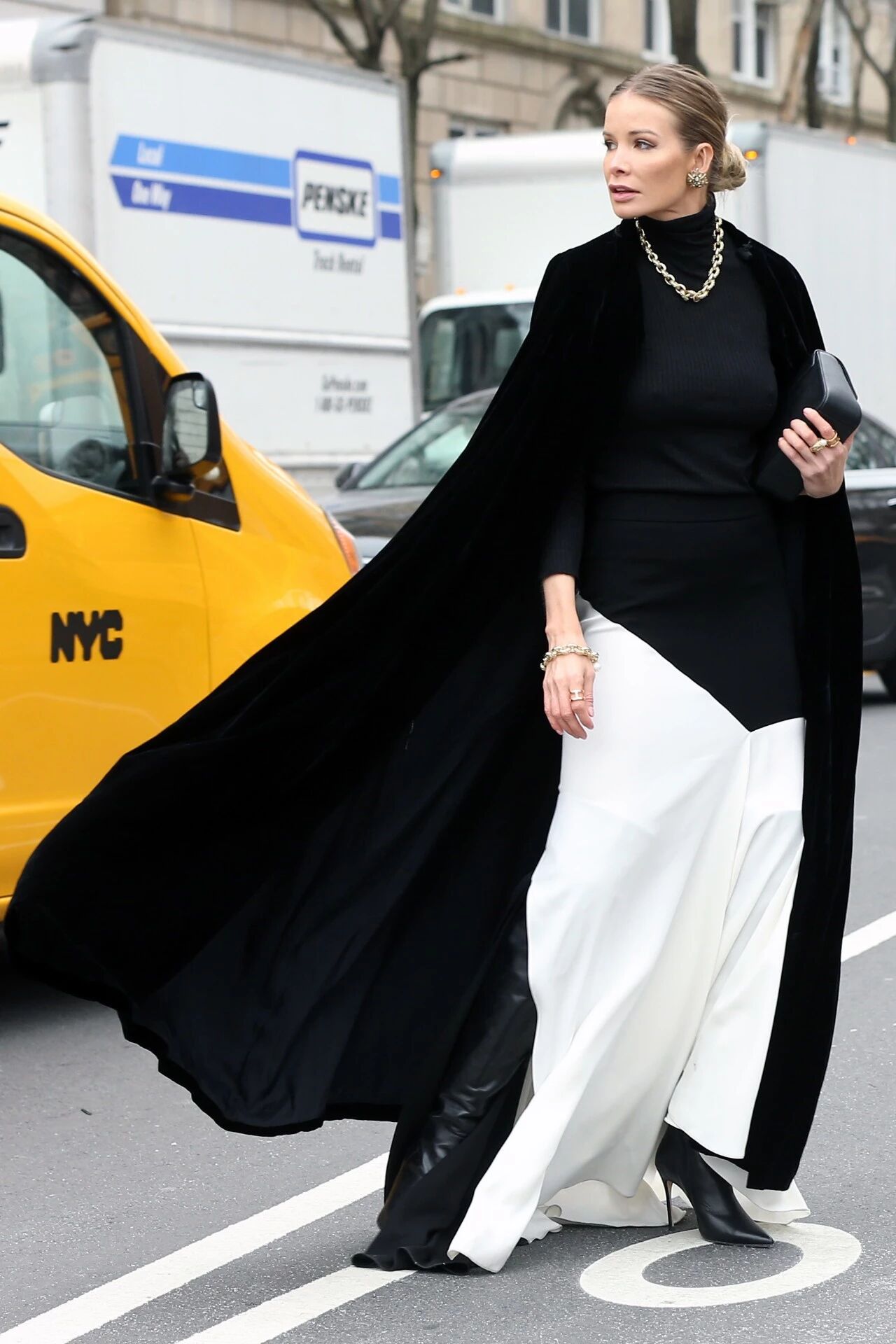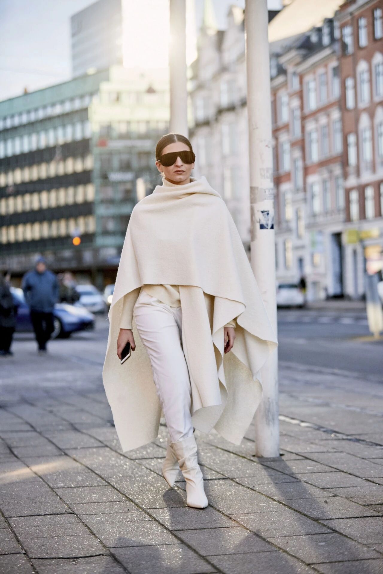 长款大衣斗篷更有魅力,它和风衣一样挺阔有型、凸显气质,却又不像羽绒服那么拘谨,Caroline Daur一身白色剪裁精致的斗篷大衣,黑色作为点缀,干练又时尚。
