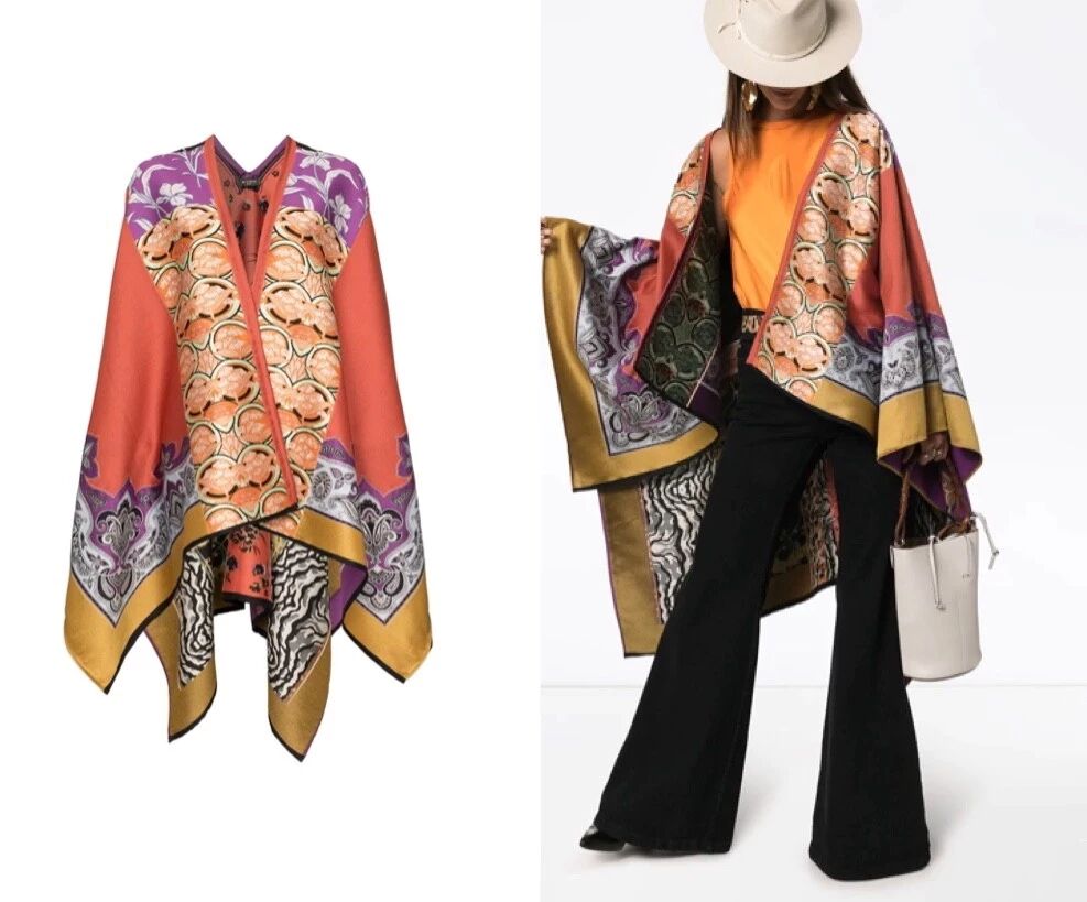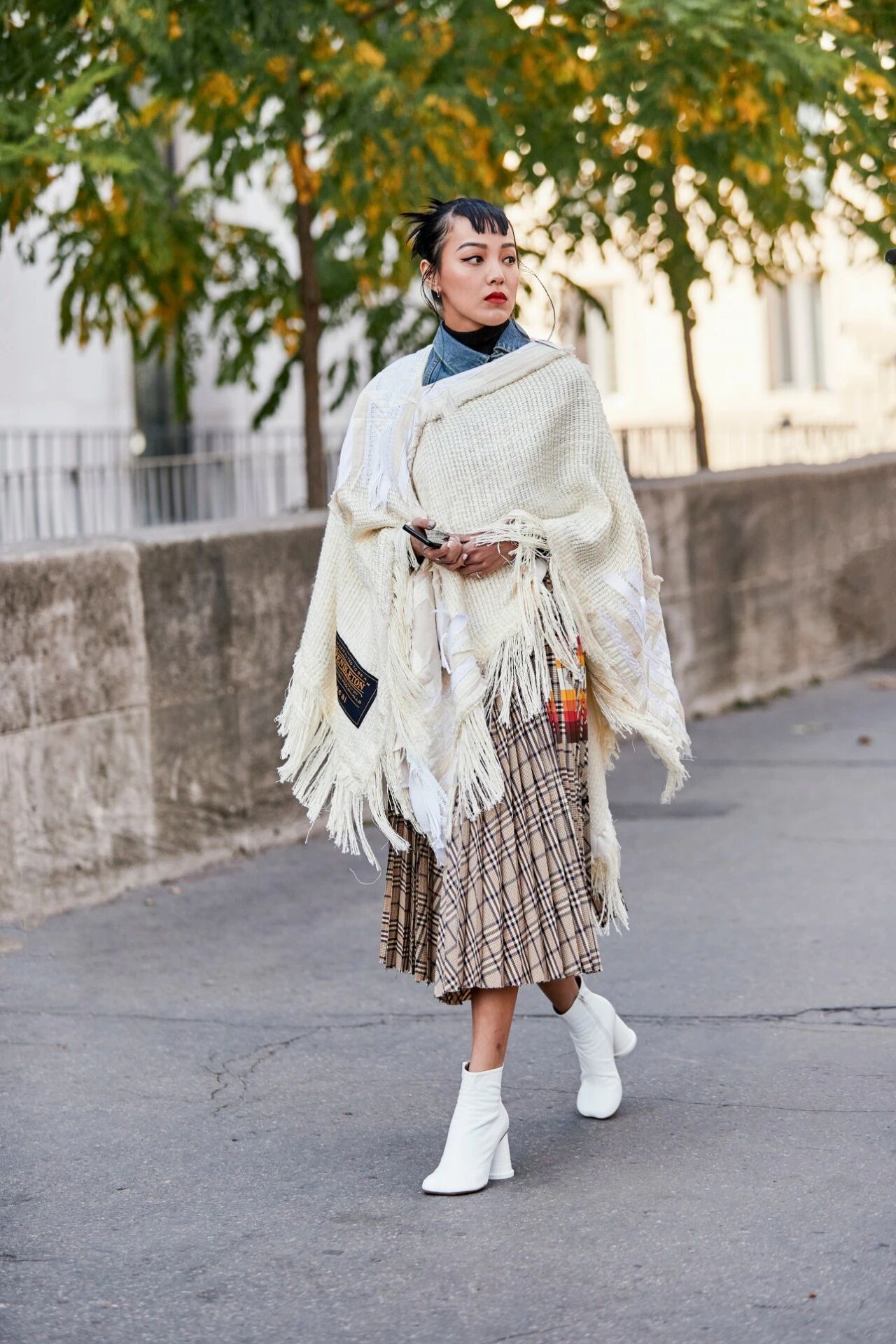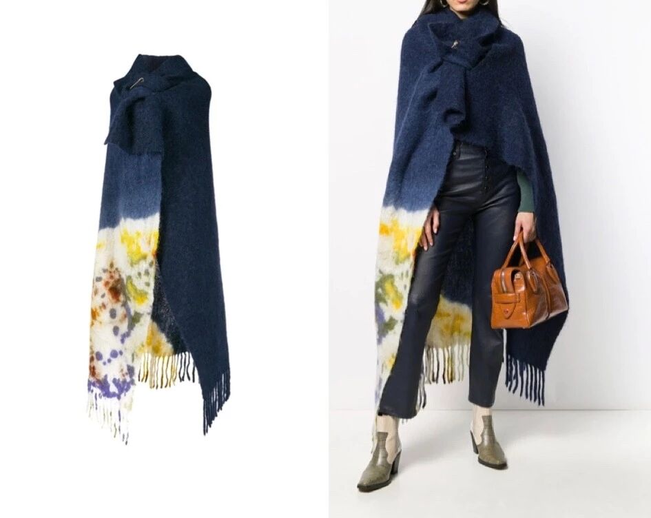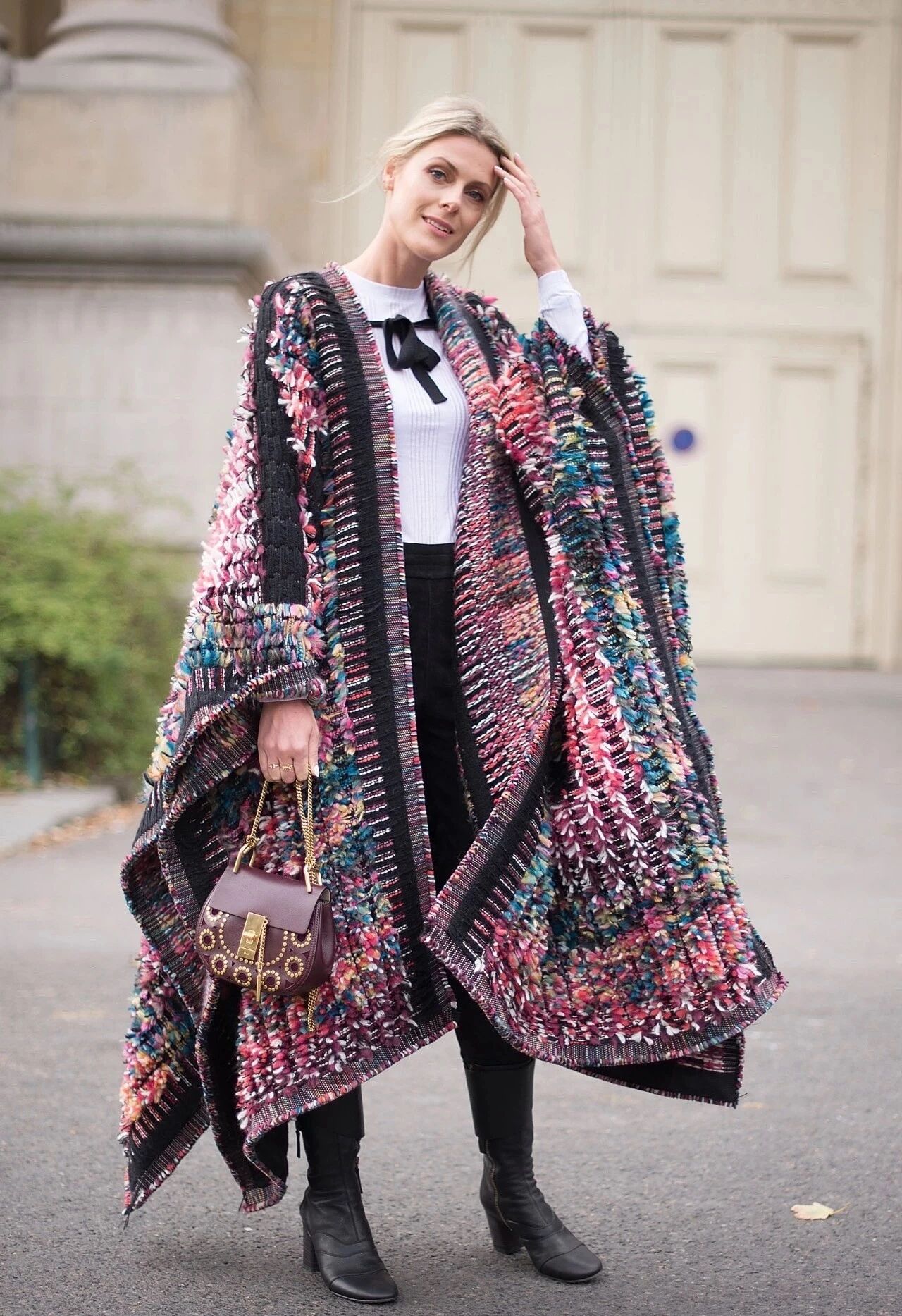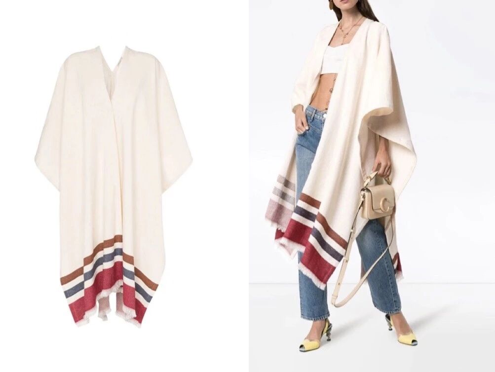如今流行的不好好穿衣,也可以在斗篷中找到这些元素,将两片围巾前后一拼就进化出了斗篷的全新状态。