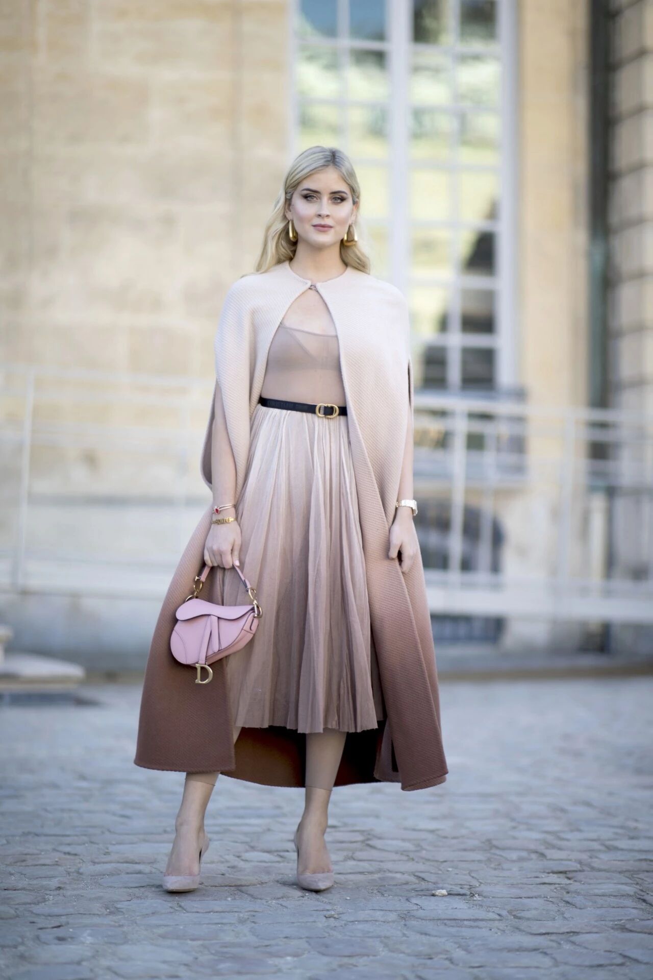 不是只有超人才会穿斗篷,时尚博主Valentina Ferragni穿起斗篷来更高级,一身Dior粉色渐变斗篷配上淡淡粉色纱裙,低度饱和的两个颜色看起来十分舒服。