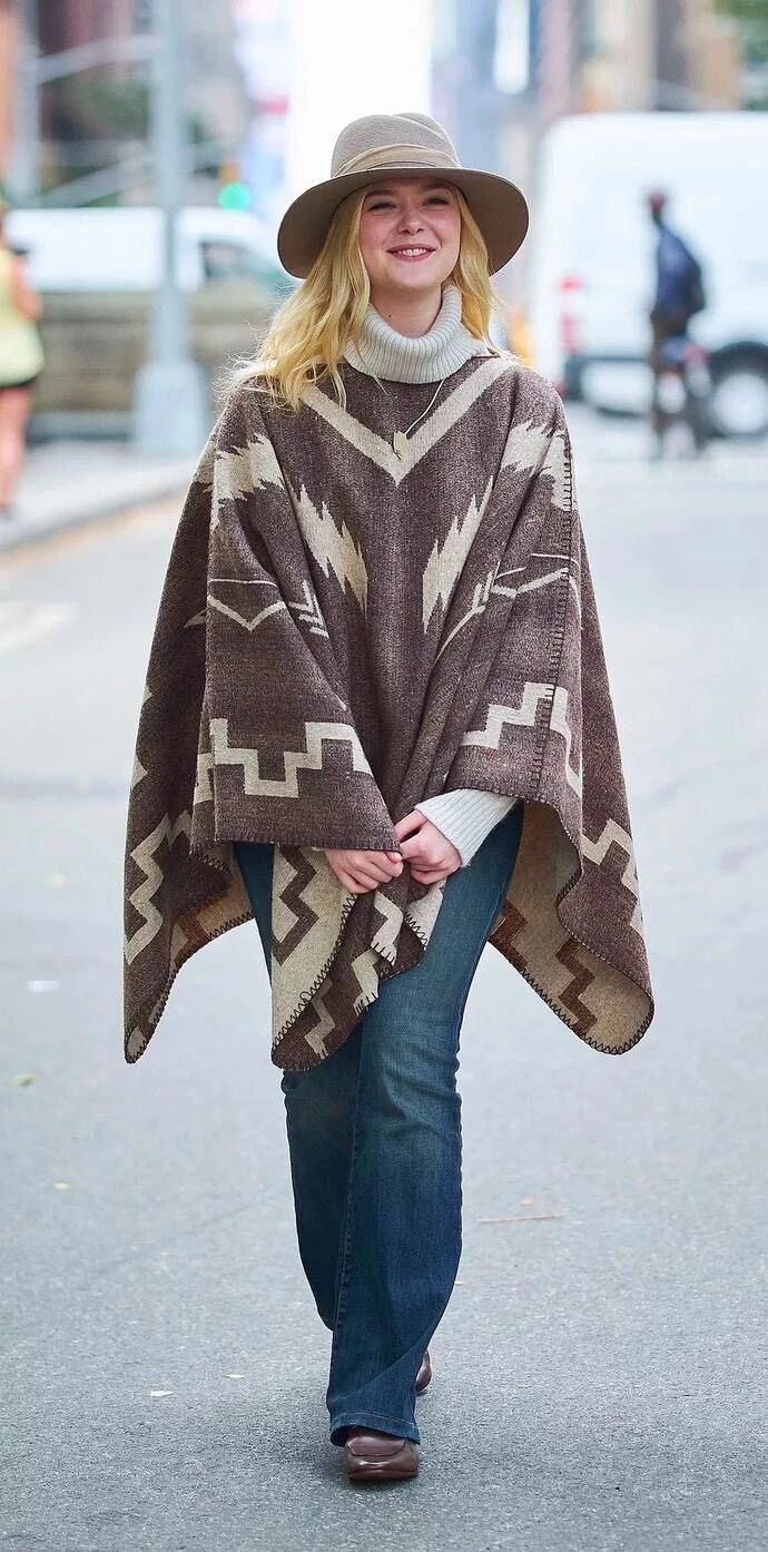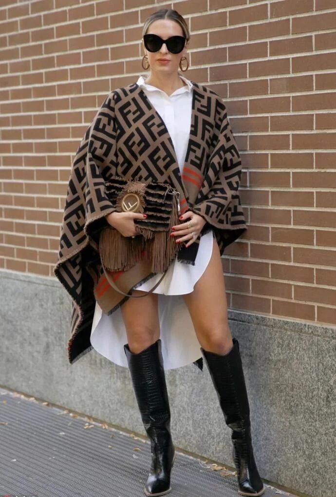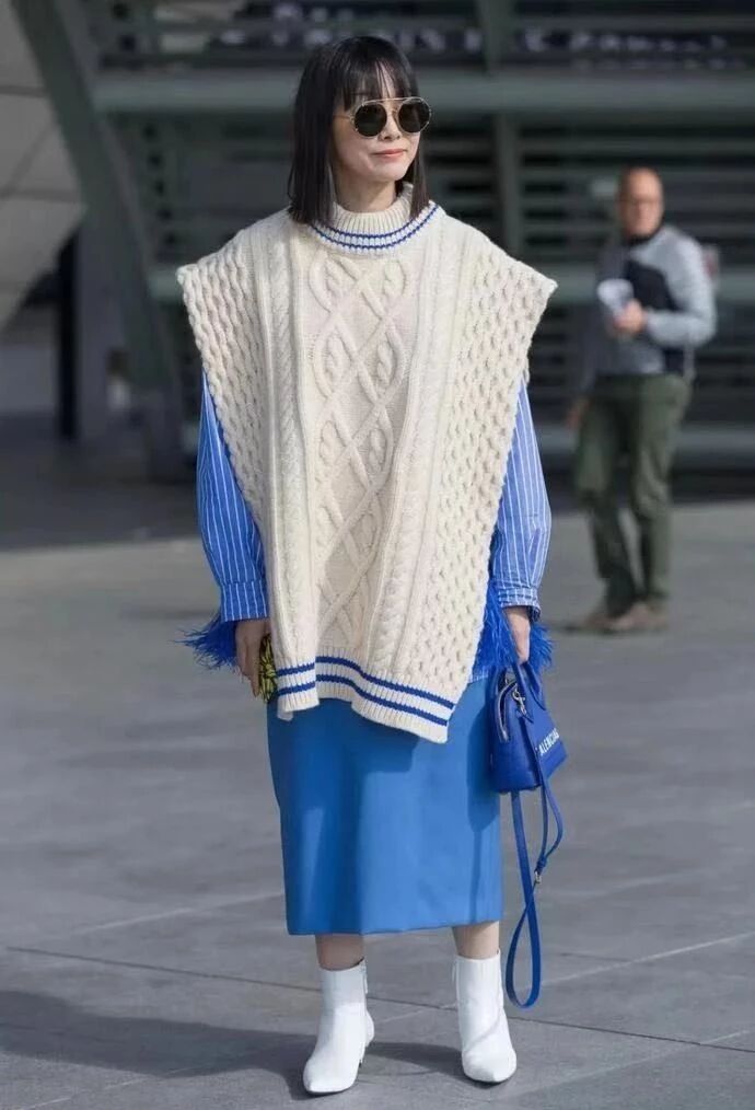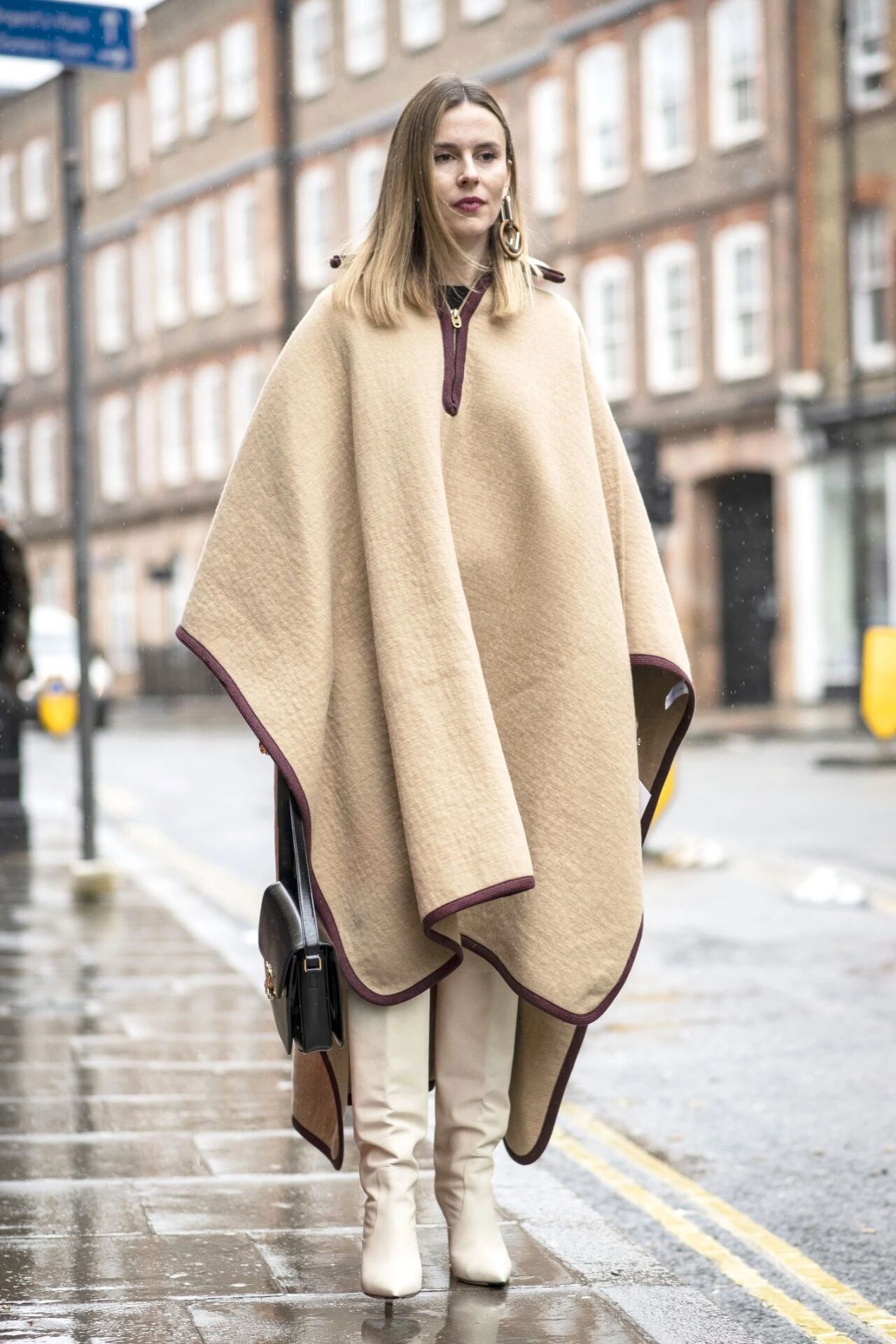 身着米色斗篷罩衫搭配上及膝靴,在完美的遮住赘肉的同时,还可以让你如人群中散发光芒的太阳,视觉上也给人很温暖的感觉。