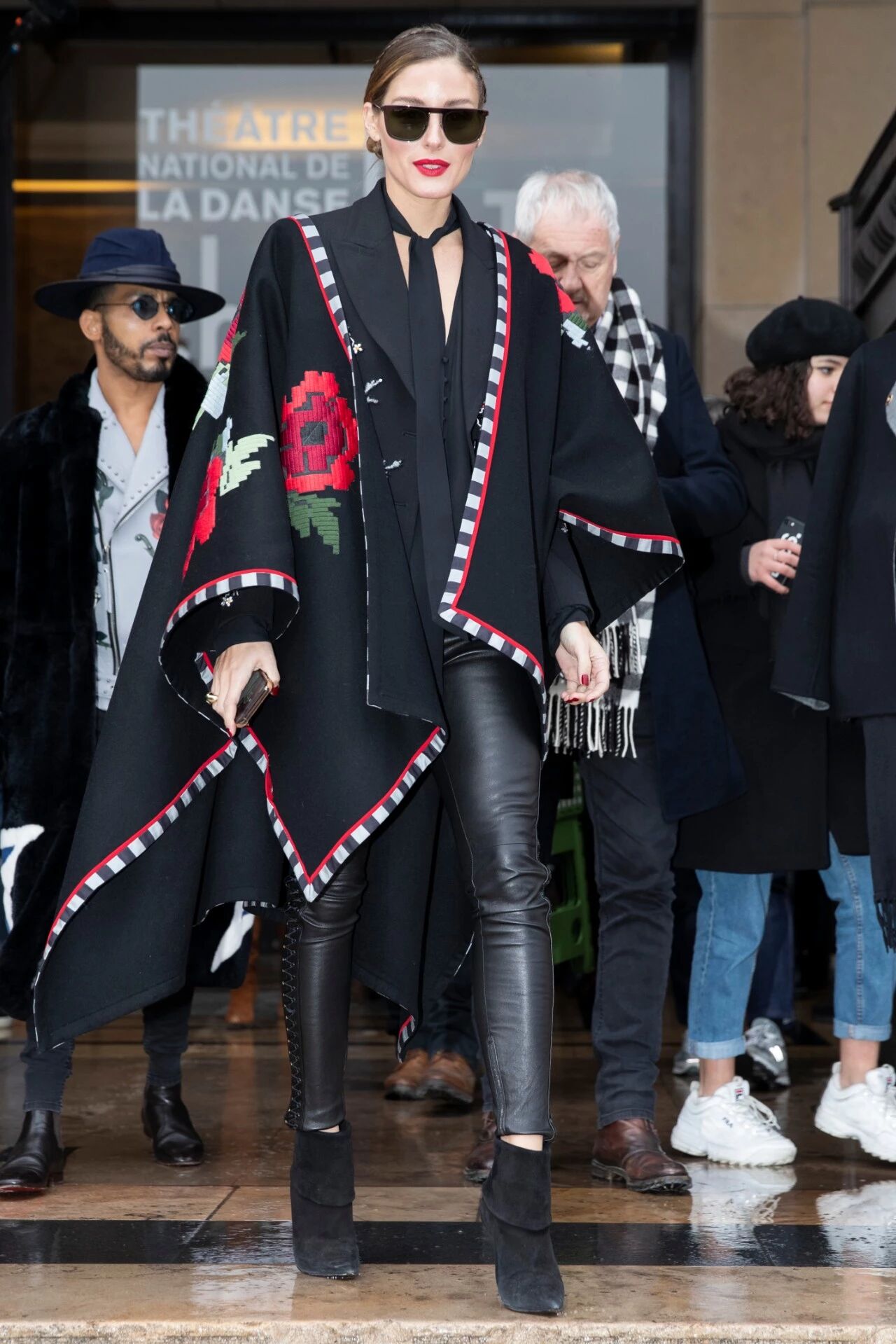 Olivia Palermo身穿黑底红花斗篷,颜色的搭配十分高级,一副墨镜增加气场,帅气的同时带着神秘感。