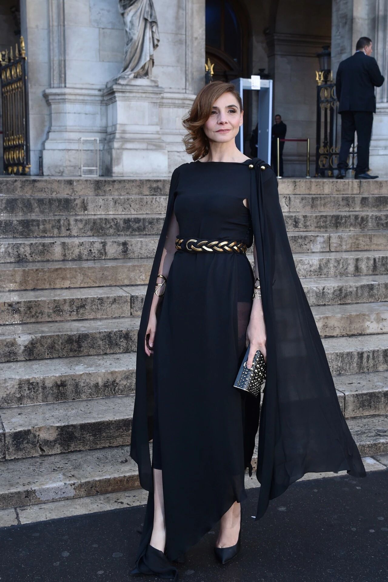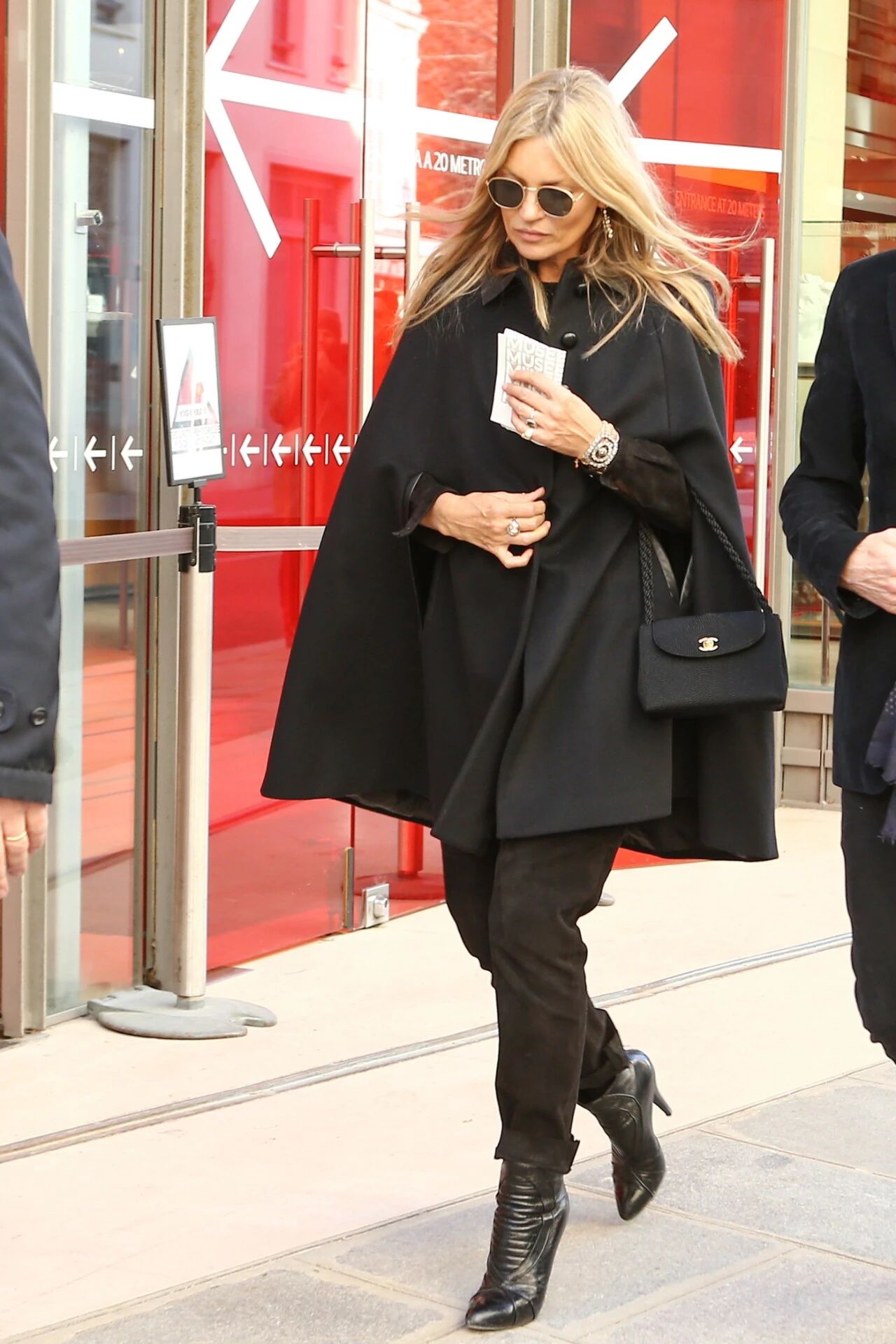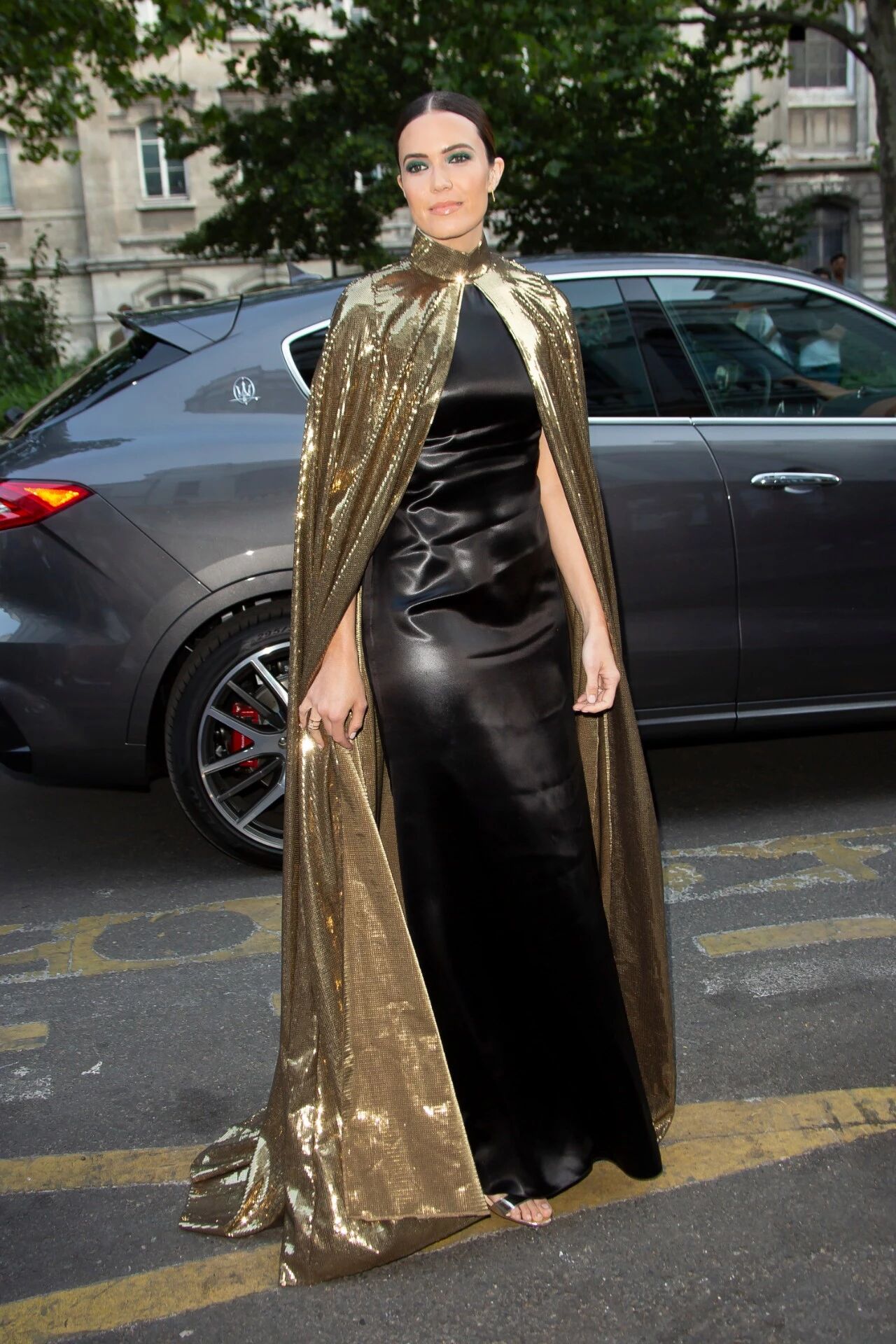 黑色裙子肩披同色沙质披风,款式简洁却又满屏的气场。