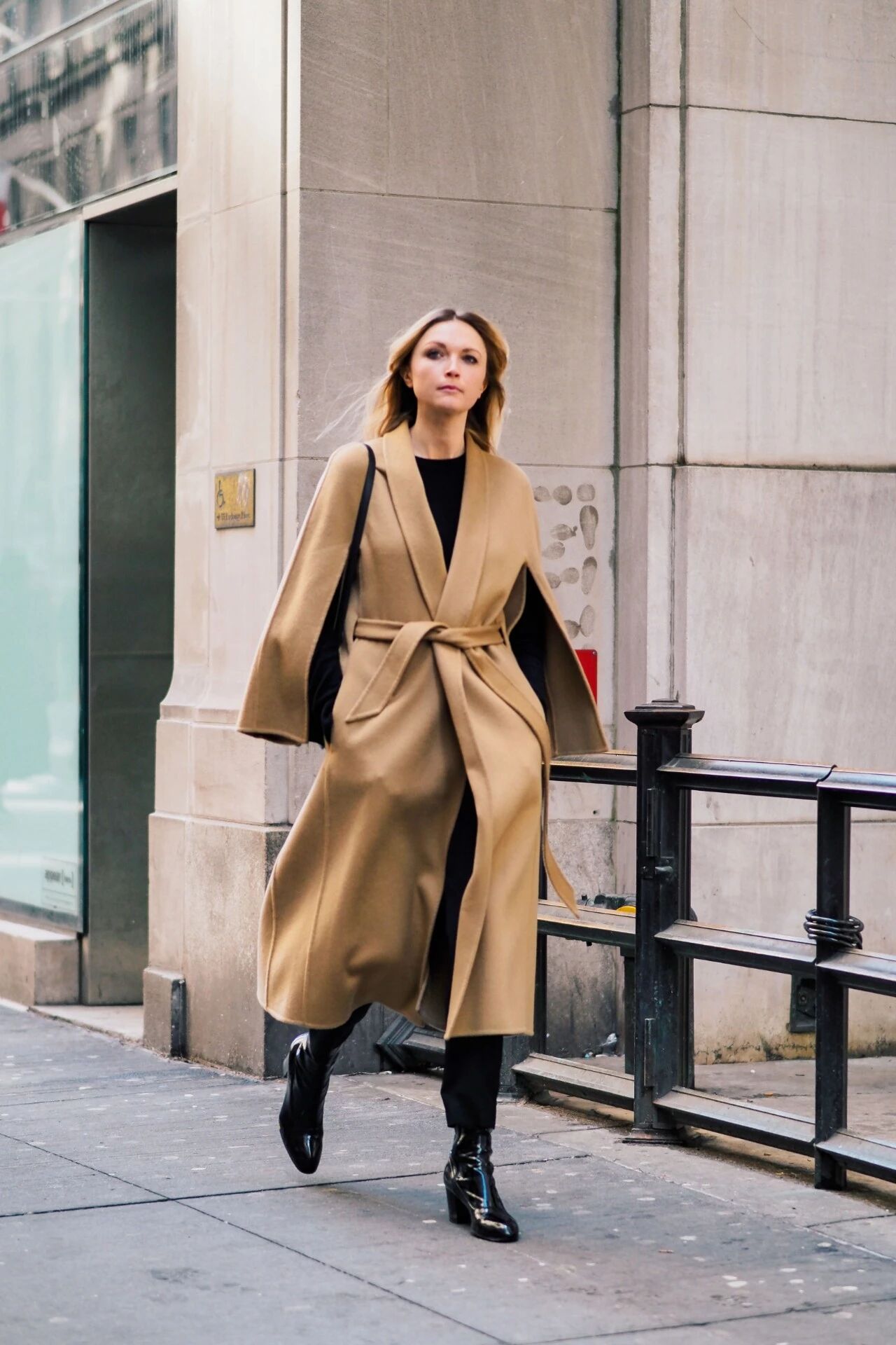 百变的斗篷大衣总能根据人的不同,而散发不一样的味道。一身卡其色斗篷大衣,搭配黑色内搭率性简约,职场通勤必备,尽显优雅摩登风范。