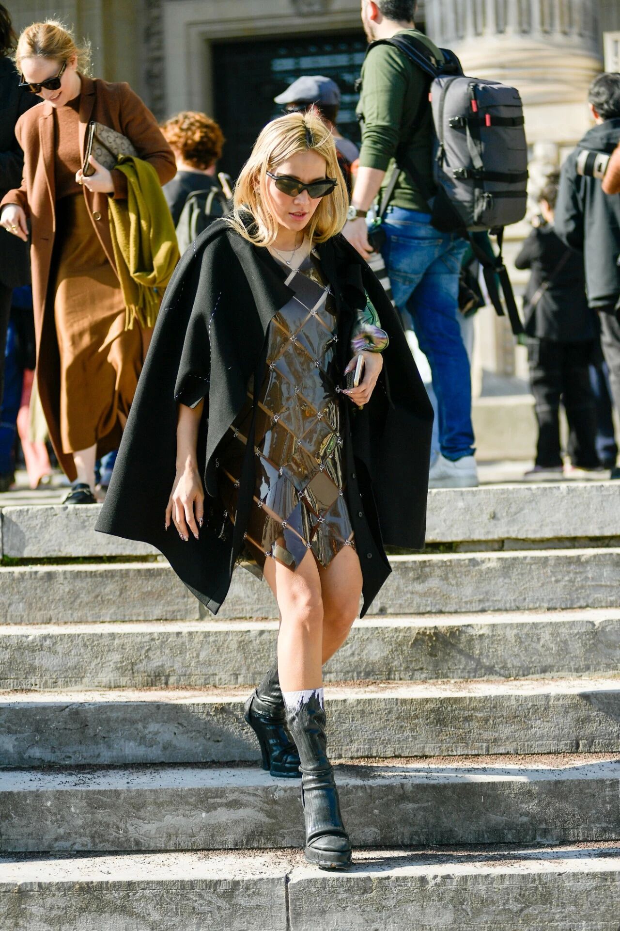 亮片打底裙搭配黑色马丁靴,外套黑色的连帽斗篷大衣,Tina Leung这身穿搭在阳光下闪闪发光,潮流气质满满。