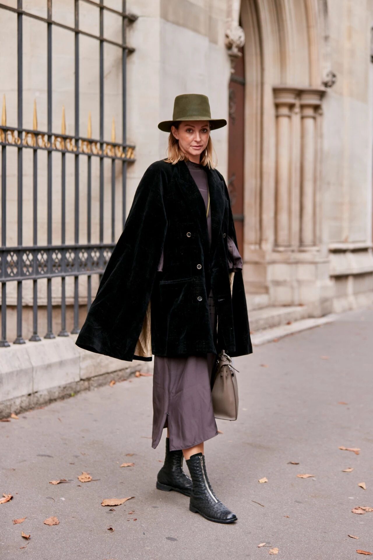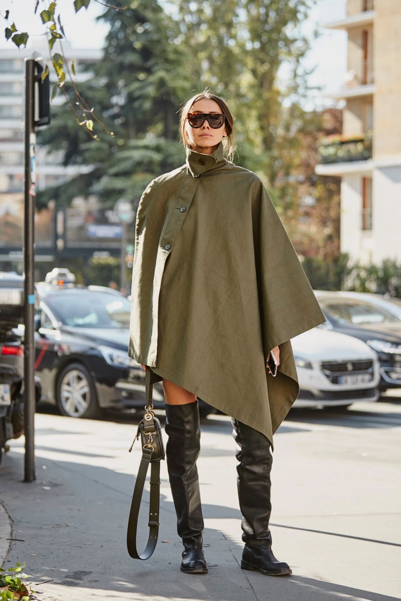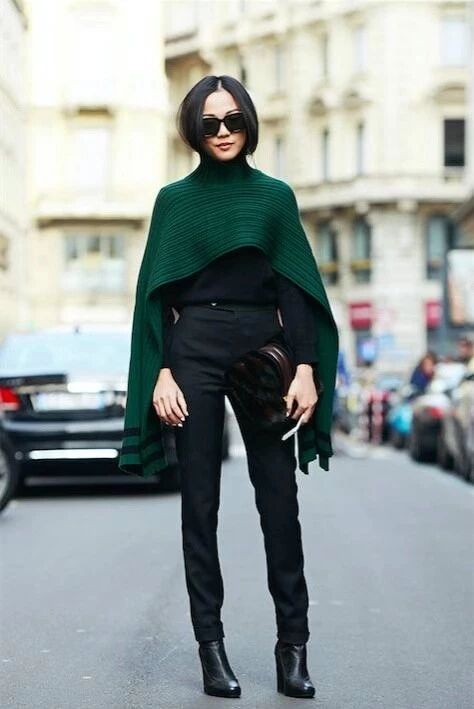 墨绿色的斗篷配上过膝长靴,显瘦的黑色搭配上绿色,不仅拉长美腿,还温暖时尚。