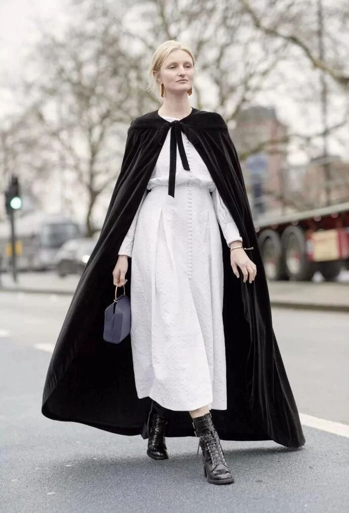 想要再优雅一点,我们来回归复古风,这种中世纪风格的简约长斗篷可以说是非常有味道了,自带优雅奢华气场。