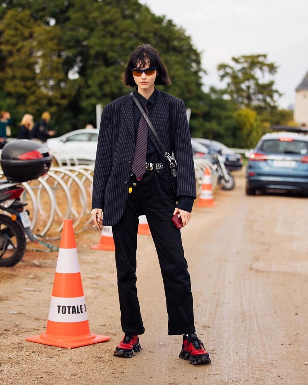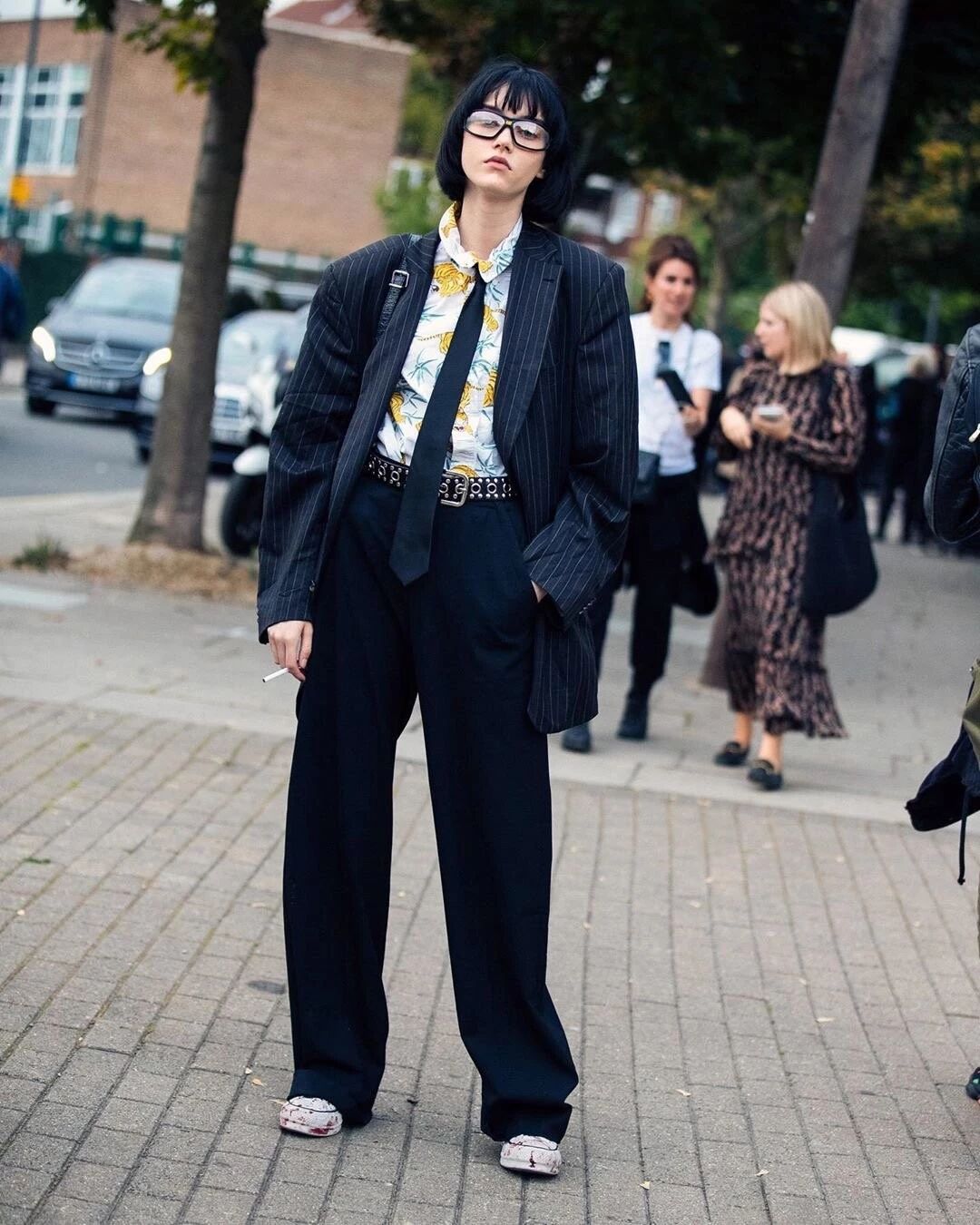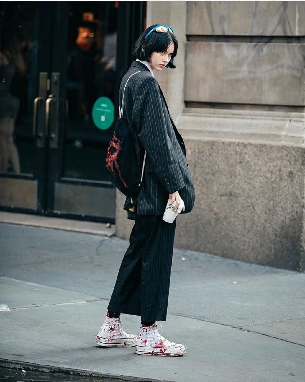 在西装的搭配上,她还特别通过小细节来显示与众不同的个性。人手一双的帆布鞋,来点随性的血迹涂鸦才够夯!