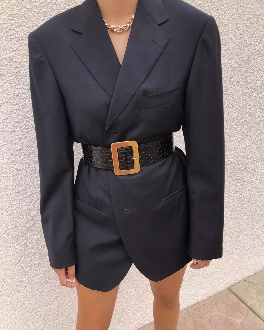 穿了带有设计感的西装和Leggings的话,大热的元素几乎都上身了,这时有一条宽腰带来“压”也不会觉得繁琐。