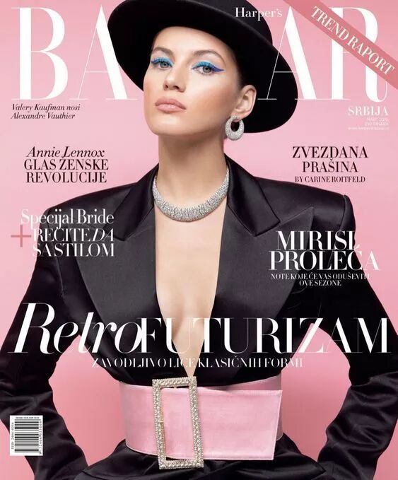 Valery Kaufman登上了今年2月刊的塞尔维亚版芭莎封面,粉色的超宽丝绒腰带在照片中非常抢眼,粉色的腰带一点也不会土里土气。