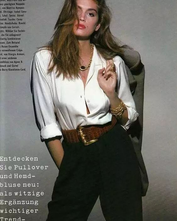 90年代的超模Cindy Crawford穿着简简单单的白衬衫,但是加了一条大号的腰带后顿时多了些味道。