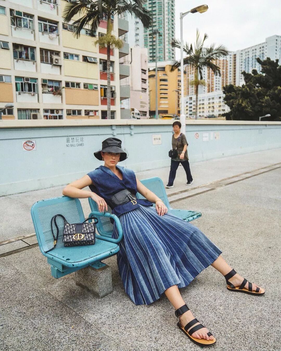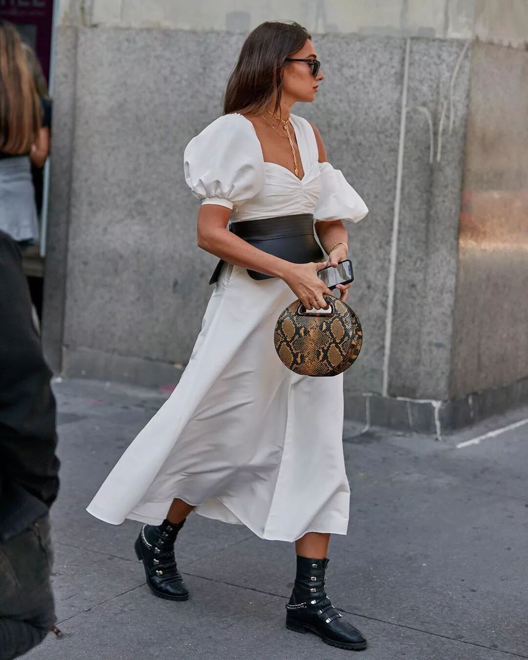 博主Holly Titheridge穿着泡泡袖连衣裙系了一条相当宽的腰扣,倚在椅子上,整个状态Chill又惬意。