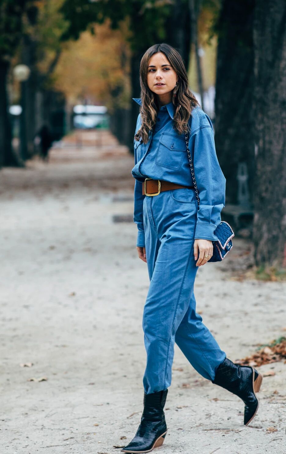 一身普通的单宁,加上腰带马上变得不一般,鞋跟与腰带同色这个小细节也不容忽视。