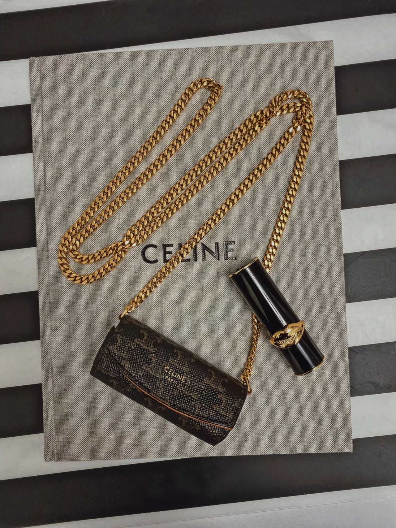 “可能会有六个包,其中一款,最近最喜欢的一款,就是CELINE经典的Triomphe Monogram那一款口红包,非常喜欢Monogram那种复古感,链子是金属链子,很HEDI SLIMANE的摇滚风格,虽然没用,但是背上就很CELINE很HEDI~当时看到第一眼就没有犹豫就买了,其实迷你包的价格也不是特别贵,虽然没有什么卵用,就看你怎么去衡量它了。但是从时髦值的角度来看还是超值的。”