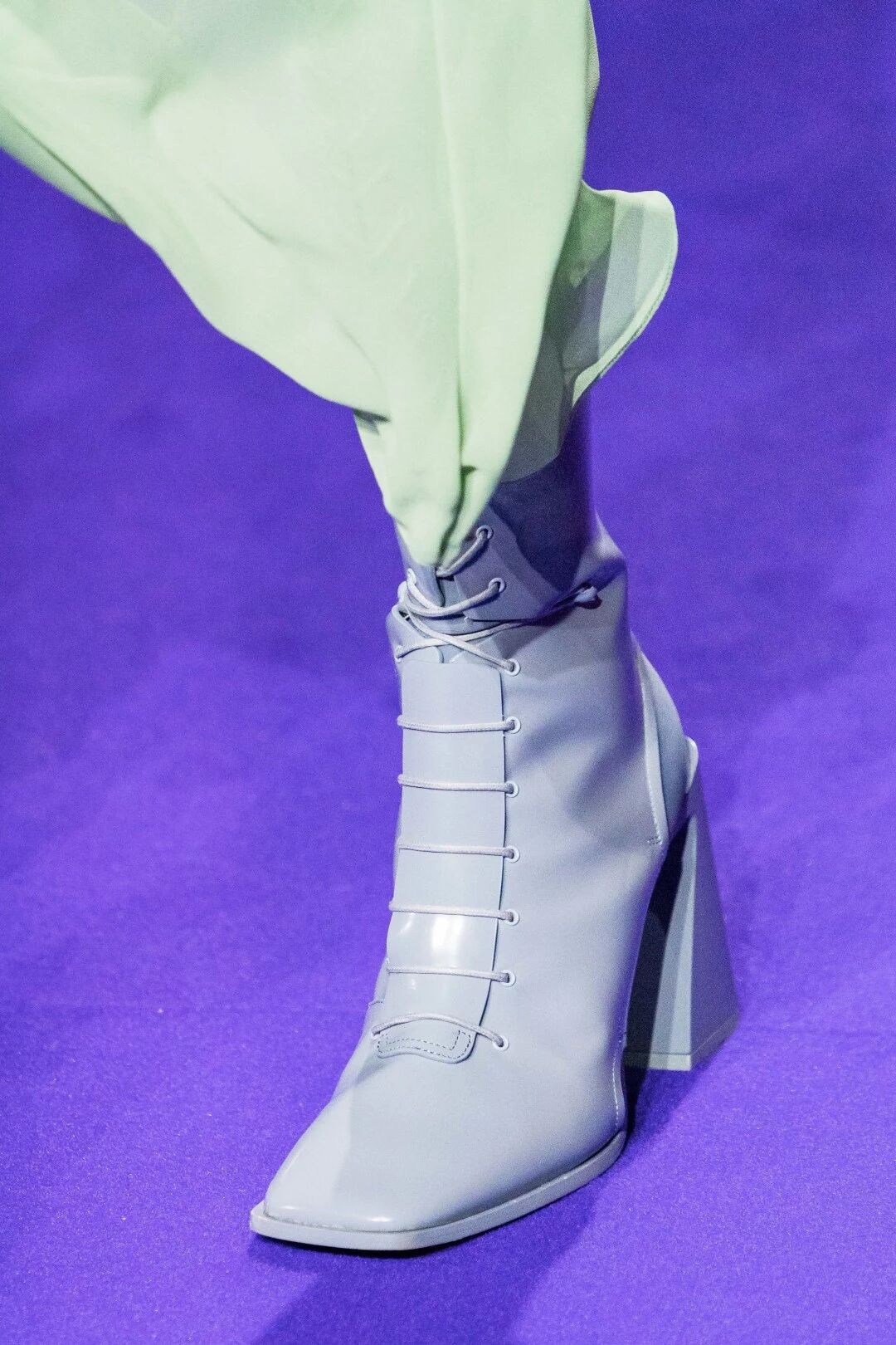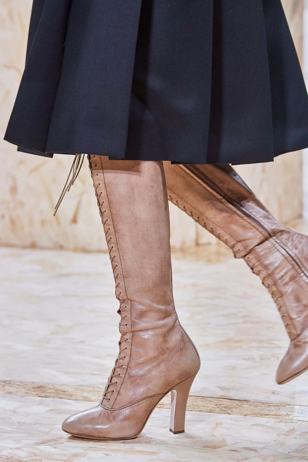 而这份对时髦满分的自信,正是“偷师”于秀场上一个个脚踩绑带靴,飒飒生风的模特们。Miu Miu 2020春夏大秀上,绑带靴直接穿越回了维多利亚的时代,双层鞋舌设计和过膝的长度,将复古和现代感完美融合。