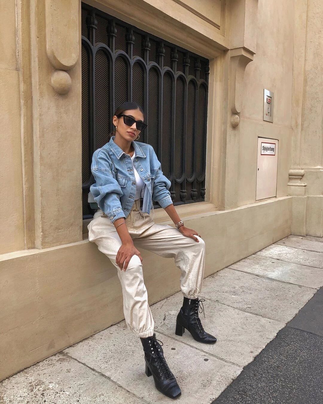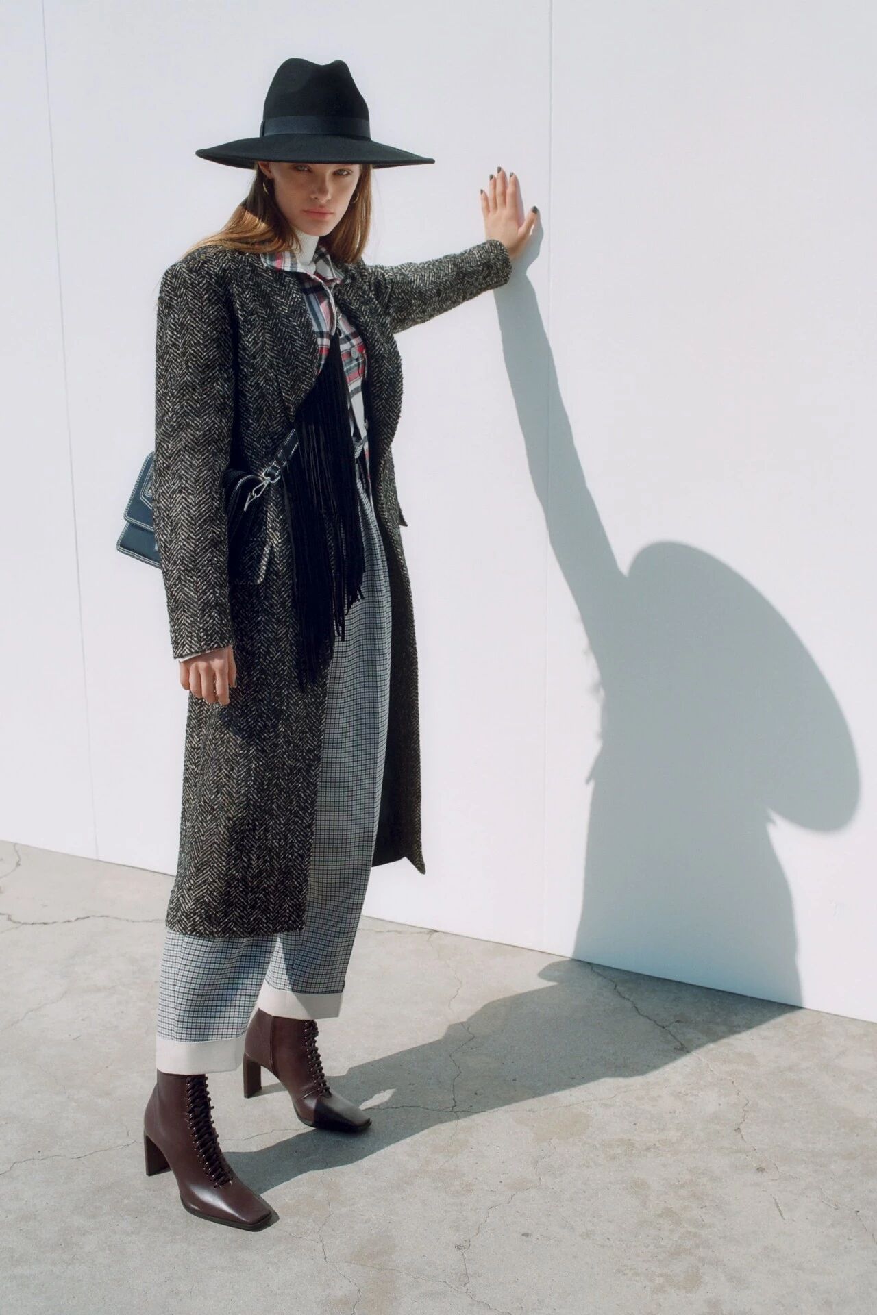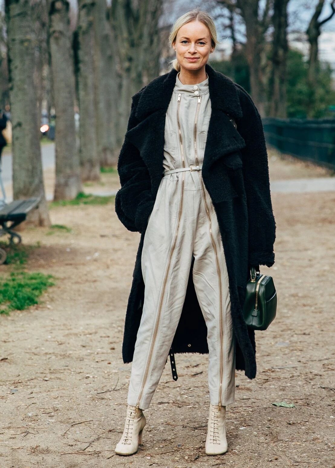 时尚总监兼品牌主理人Thora Valdimarsdottir一条工装连体裤搭配米白方头绑带靴,为我们完美打样秋冬潇洒look。