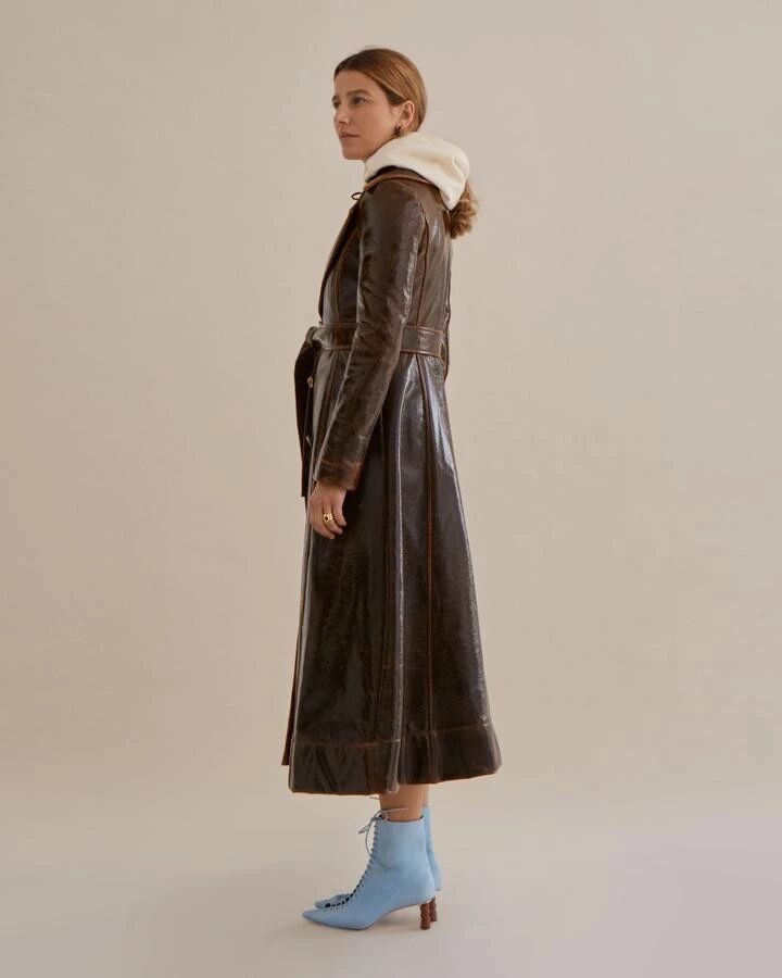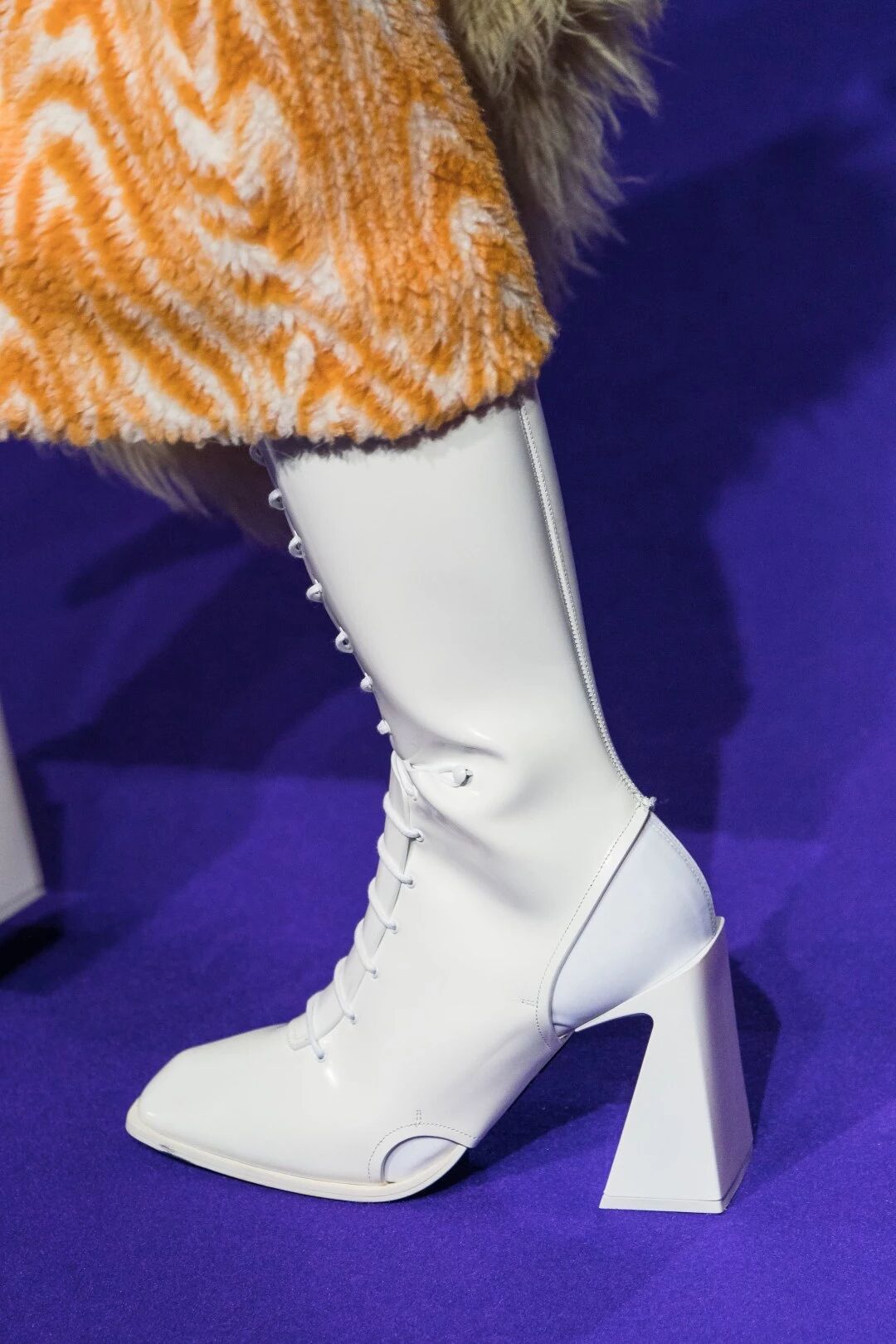 但其实这种从鞋舌处开始的拼接设计是参考了维多利亚时期靴子的造型,楔形鞋跟等也特别复古和精致。