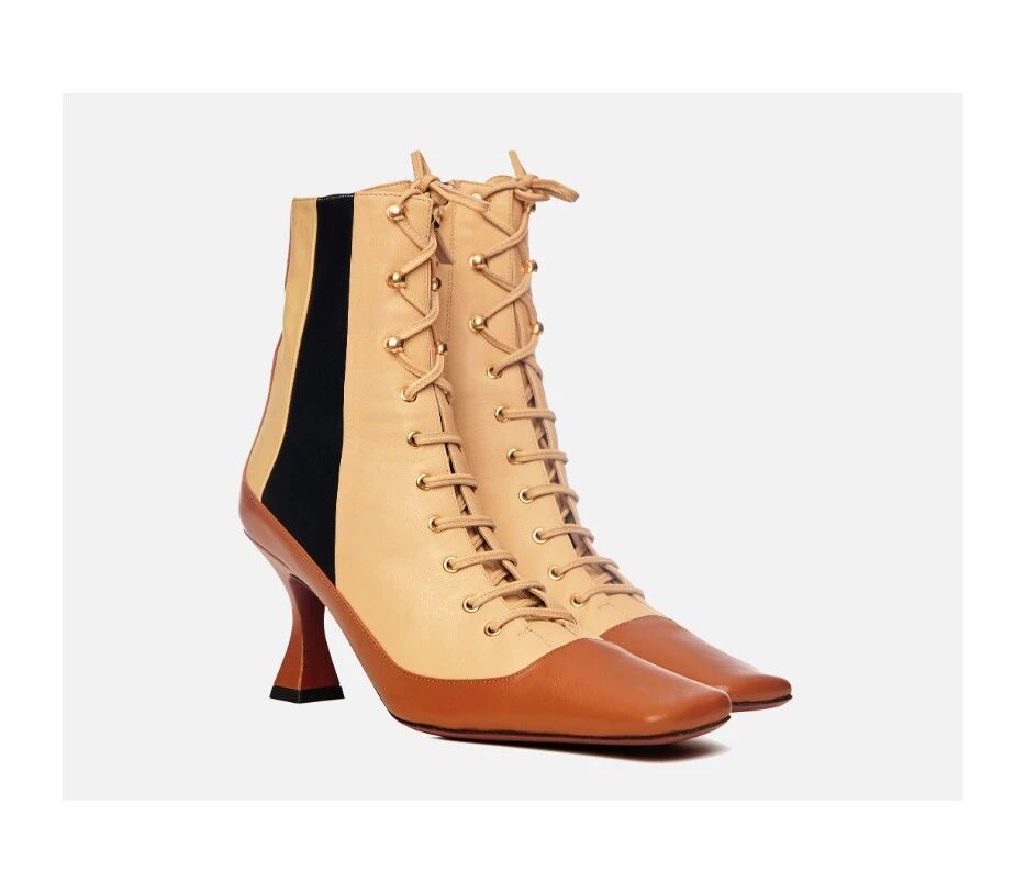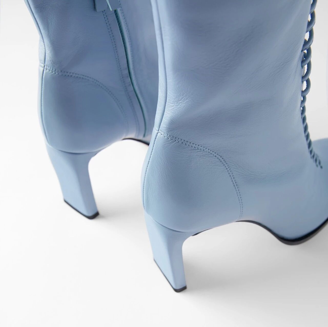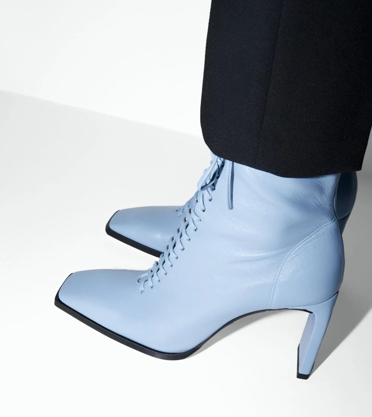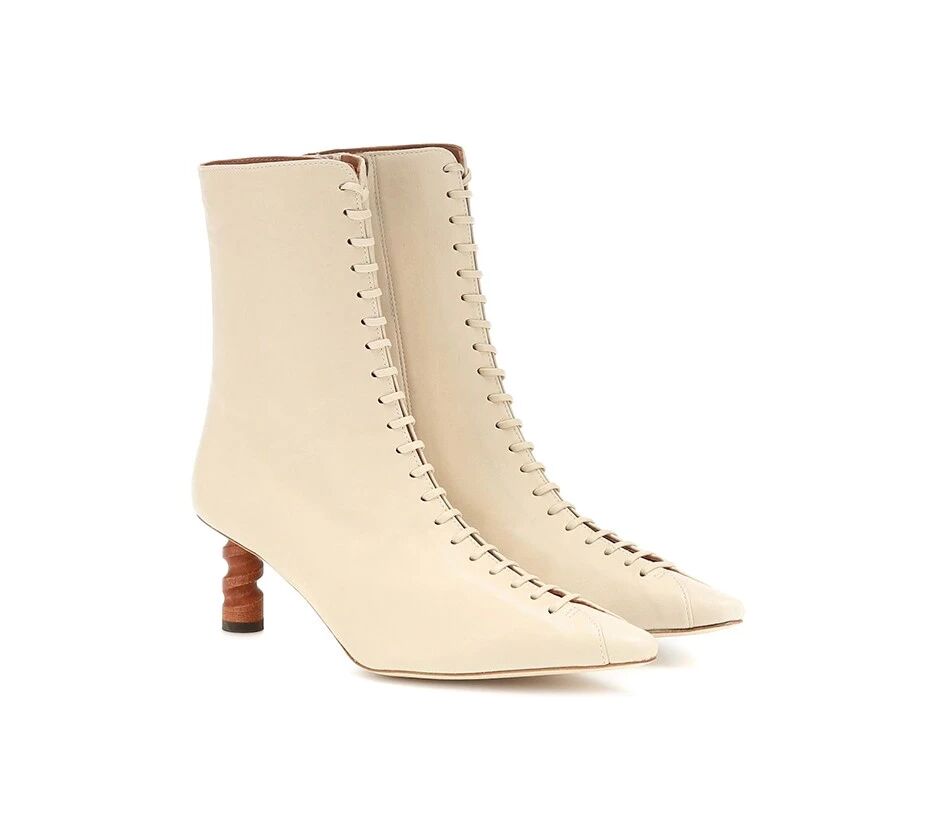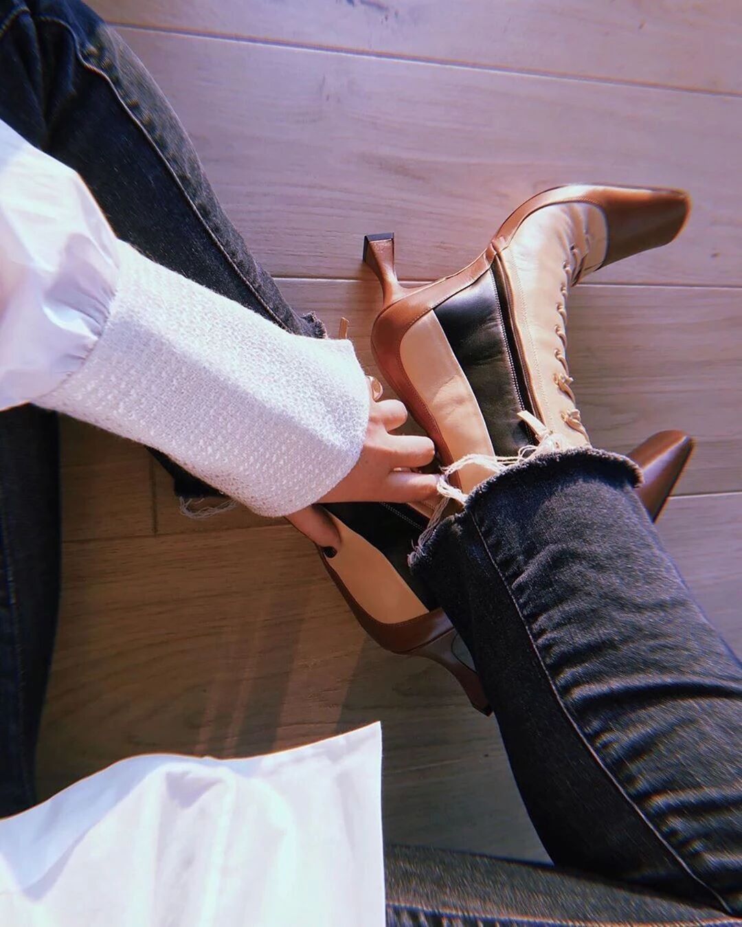 这款造型独特的方头拼接绑带靴一经推出就受到了火热的追捧,曾经爬墙的时装精们再次成为死忠粉。
