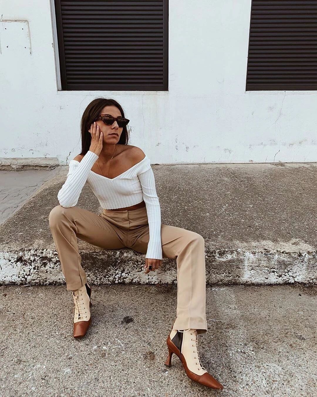 随后就是用换衣服不换鞋的戏码疯狂为它带货。米白一字肩上衣搭配浅棕西装裤,与“鸭靴”配色完美呼应。