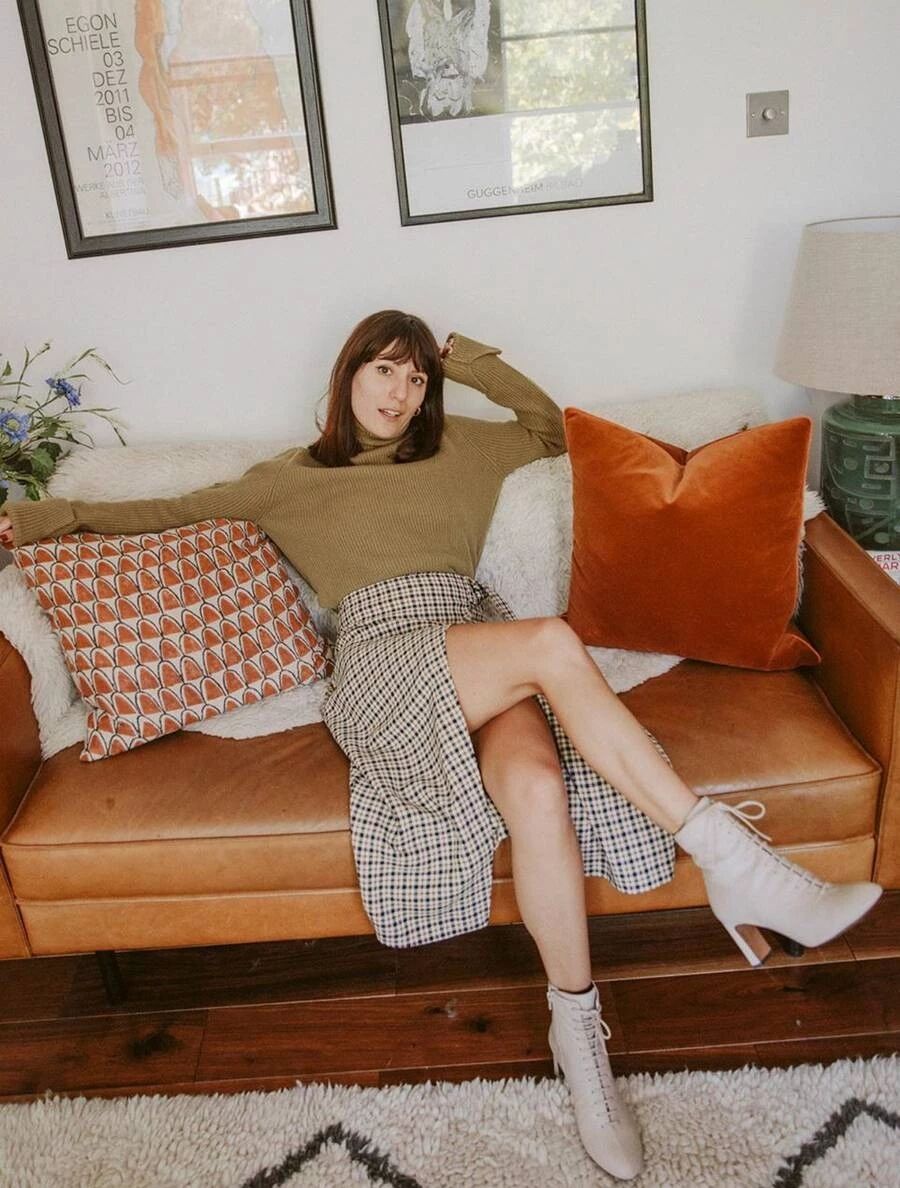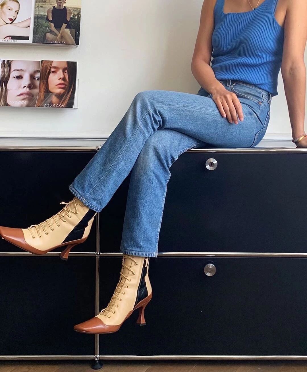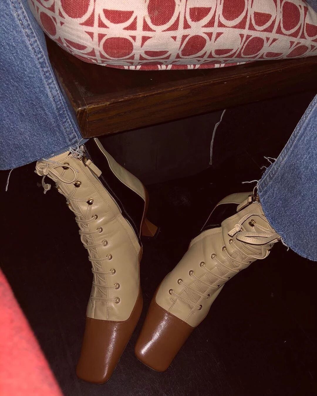 时装博主Lucy Chadwick脚穿焦糖色紧身绑带靴,复古又飒气。