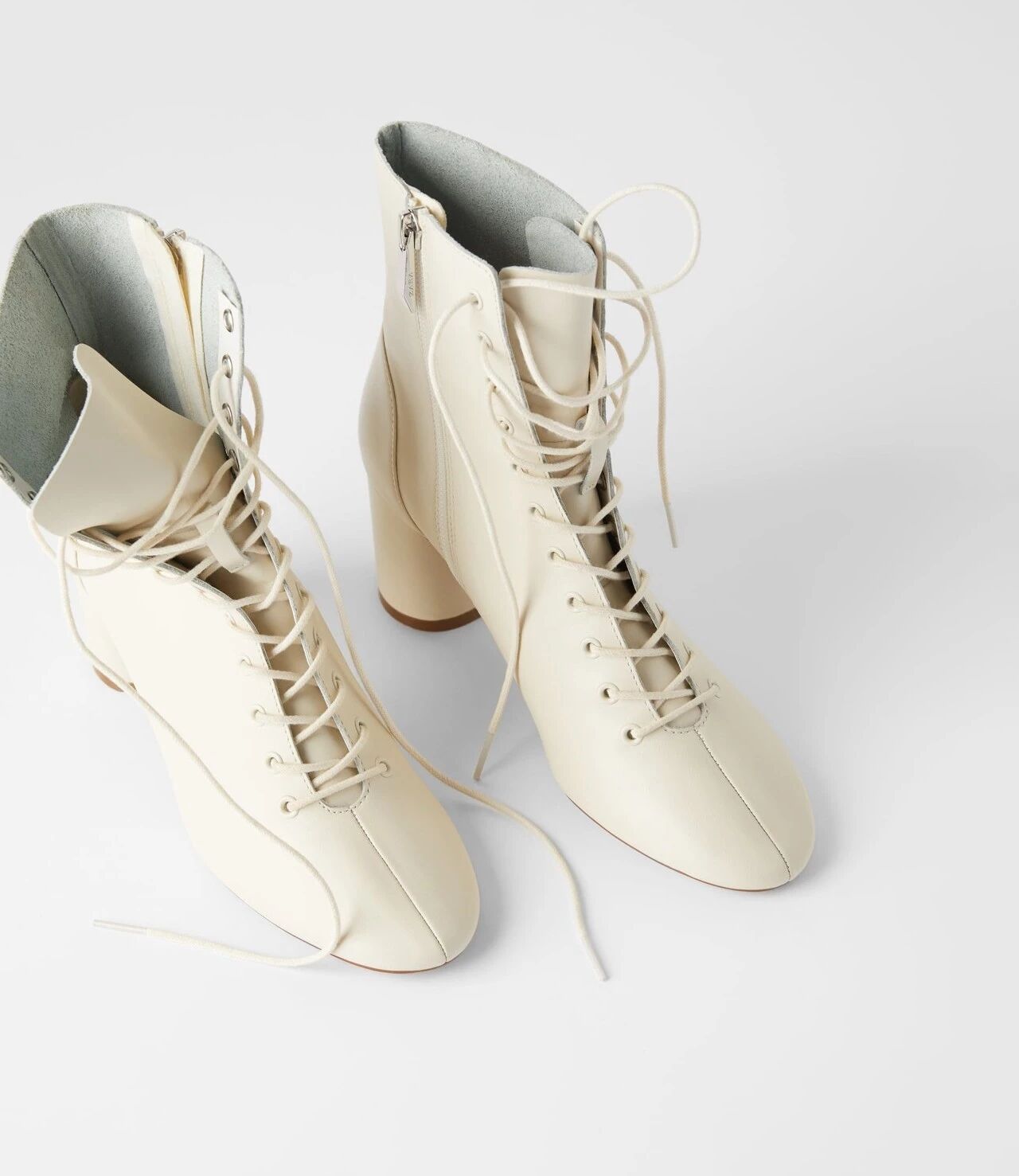 除了这个系列,Zara还推出了另一款价格更加便宜,但颜值完全不输的米白色圆头绑带鞋。
