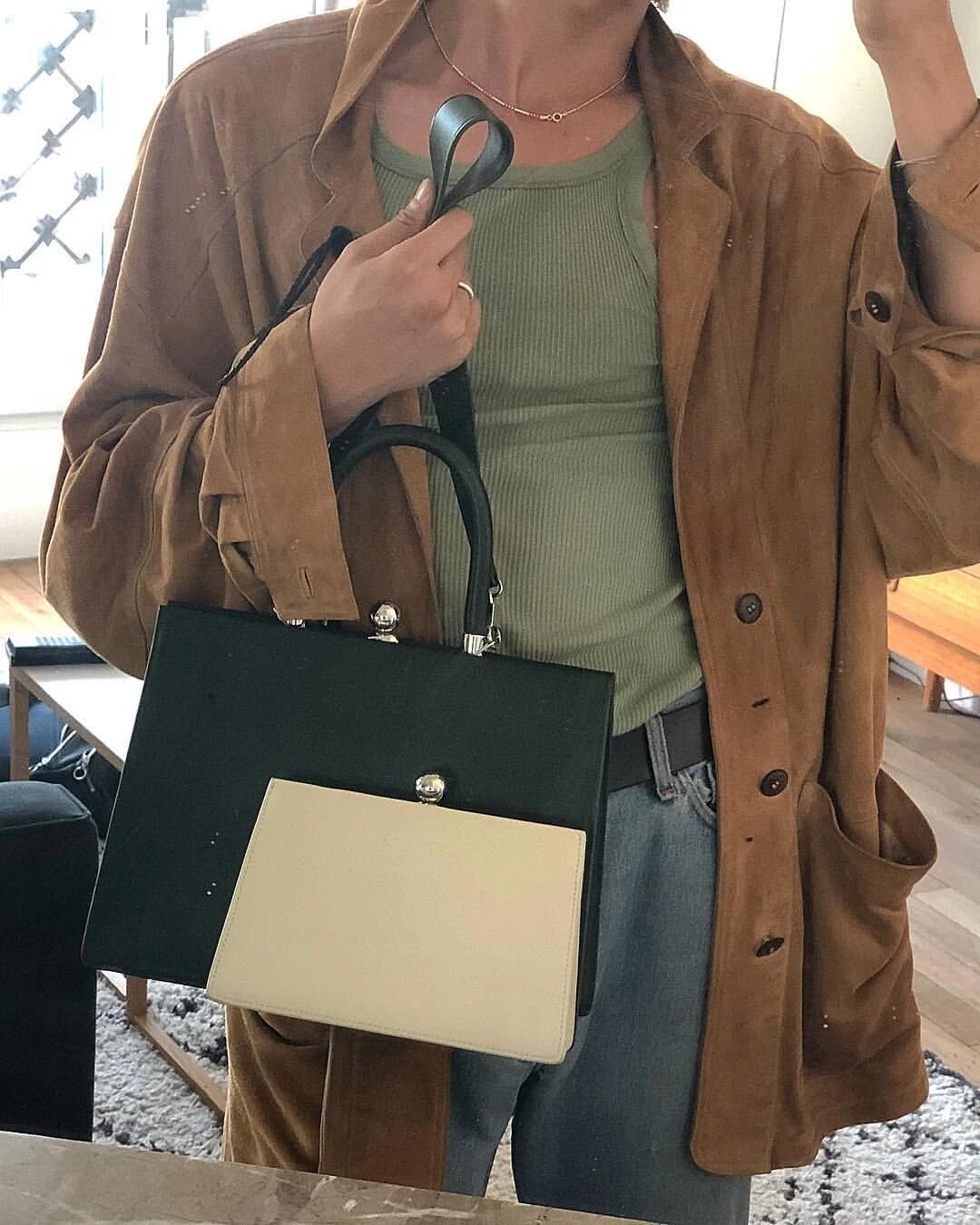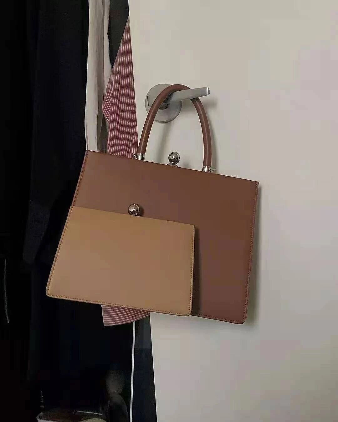 这款性冷淡风的包是可以拆卸的,就变成了公文包和手打包,在配一条肩带又可以变成斜挎包,每一款都简单高级。