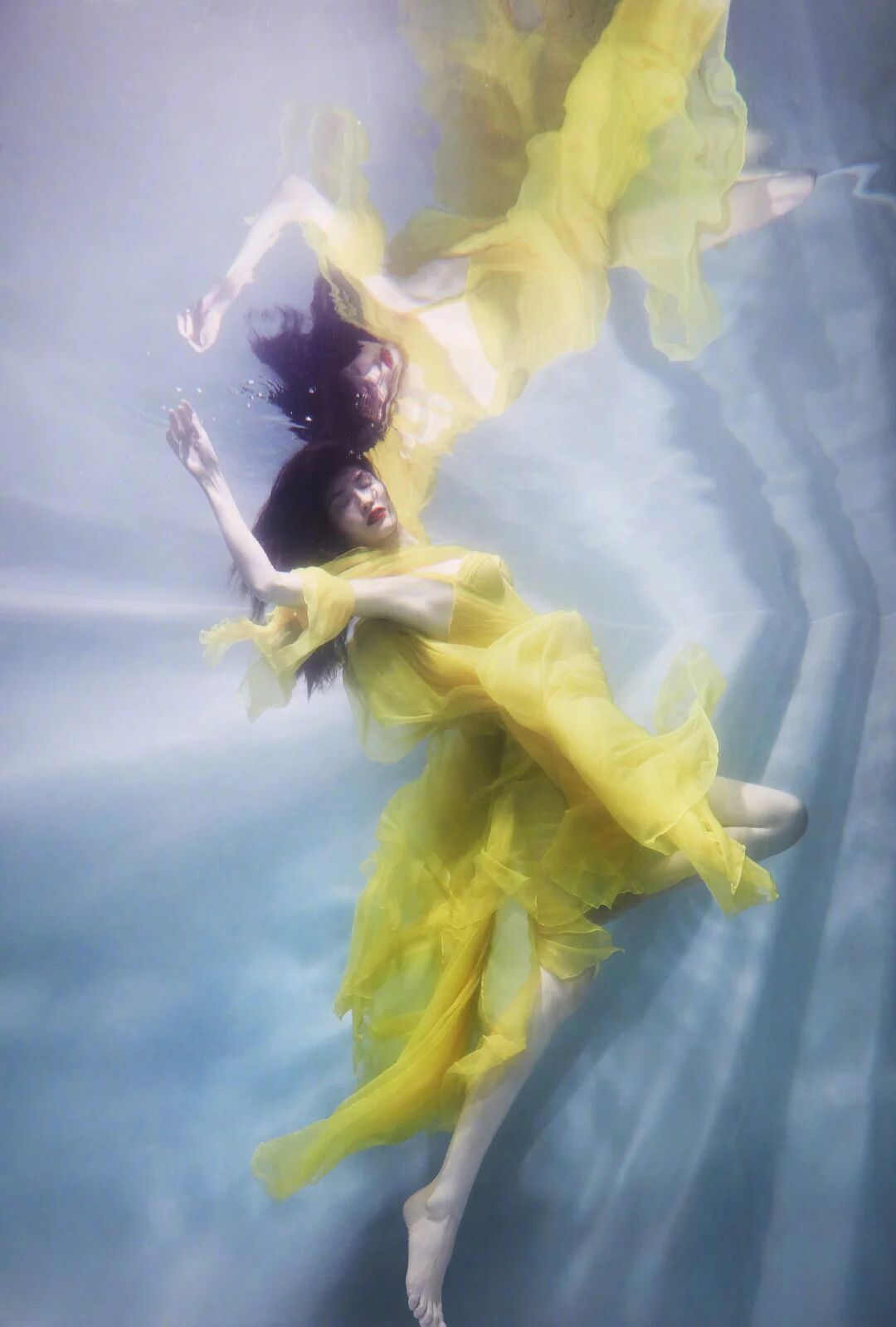 何穗身着色彩明艳的高定美裙在水中独舞,动似盛开的花朵,静似晕染的水墨画,好似一条美人鱼,如梦如幻,展示出了摄影师及其团队更多突破性的探索。“美人鱼”何穗也很辛苦,在水中舞了快20个小时。