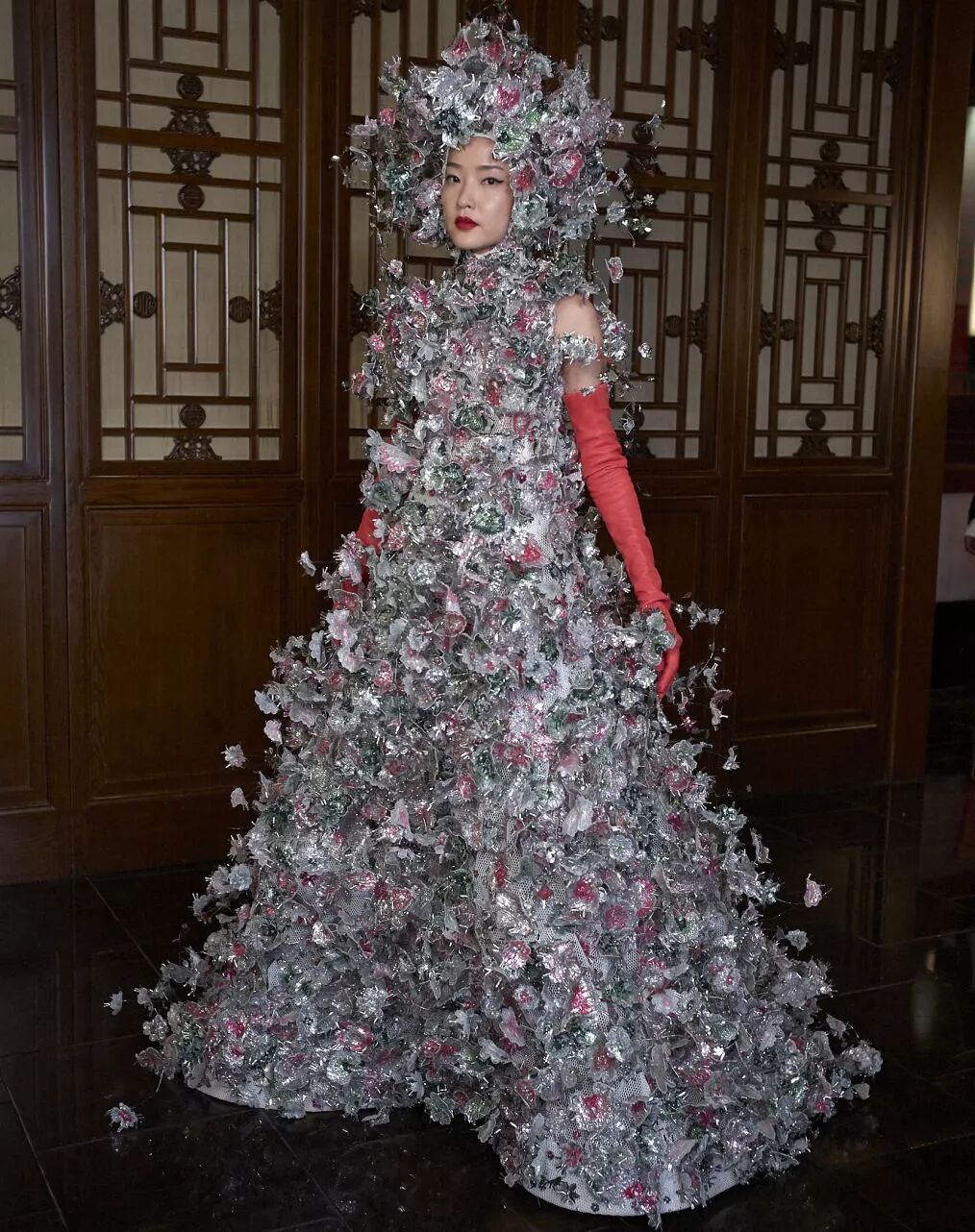 最后由杜鹃压轴的一套“巨作”,国人很容易联想到京剧中的点翠头面,Pierpaolo用自己的理解将它勾勒成一副荆棘花丛,盘绕在网面上,如同装置艺术般的礼服也是很绝了。