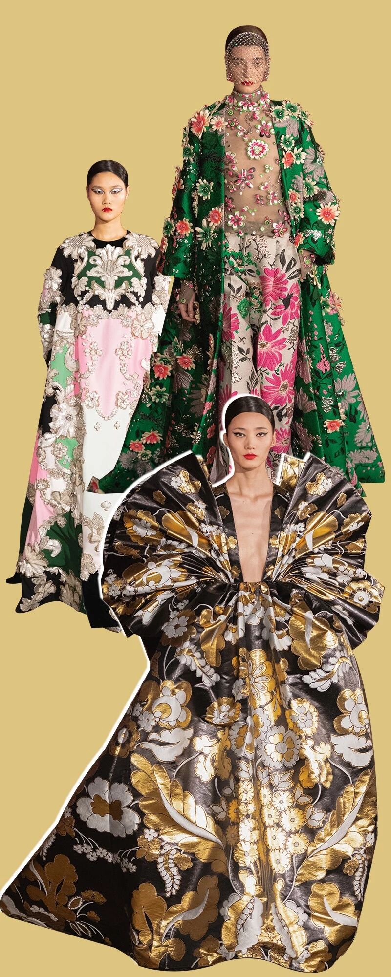 当第一套锦缎拼接亮片的礼服开启这场梦的时候,我们才发现用清醒时的梦来形容这场秀言之不过。重工的高级定制之下,本就是设计师为世事所造的梦想,它难以日日所见,却又真实存在。