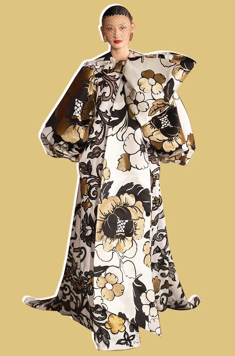 除了印花,Valentino用大量的布料和彩线绣出立体浮雕的花卉,这一下真是满园春色关不住了,廓形的剪裁和重工刺绣又有一番梦回大唐的壮观。