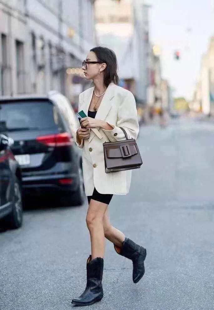 短款相较于更容易驾驭,它的包容性很强,小腿粗的女孩们也可以尝试,很显腿细,加上一条裙子,中性又柔美。