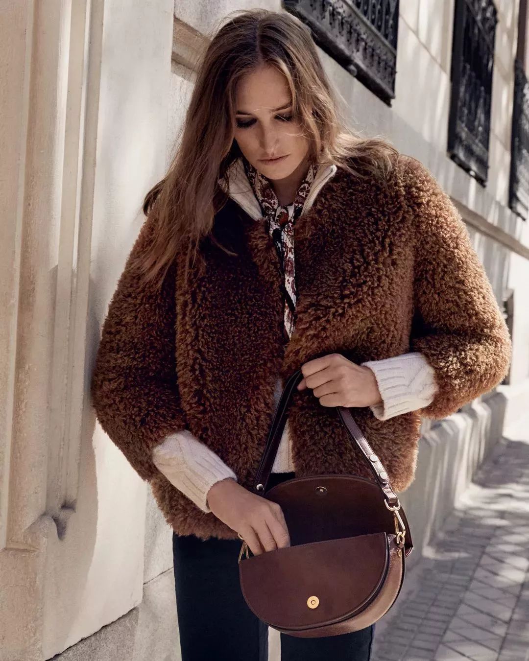 其实冬天怕臃肿的话,表姐深色穿的这种颗粒质感的毛绒小外套今年特别流行,表面是一层短短的薄绒,轻巧又保暖,一样能温暖度过寒冬。