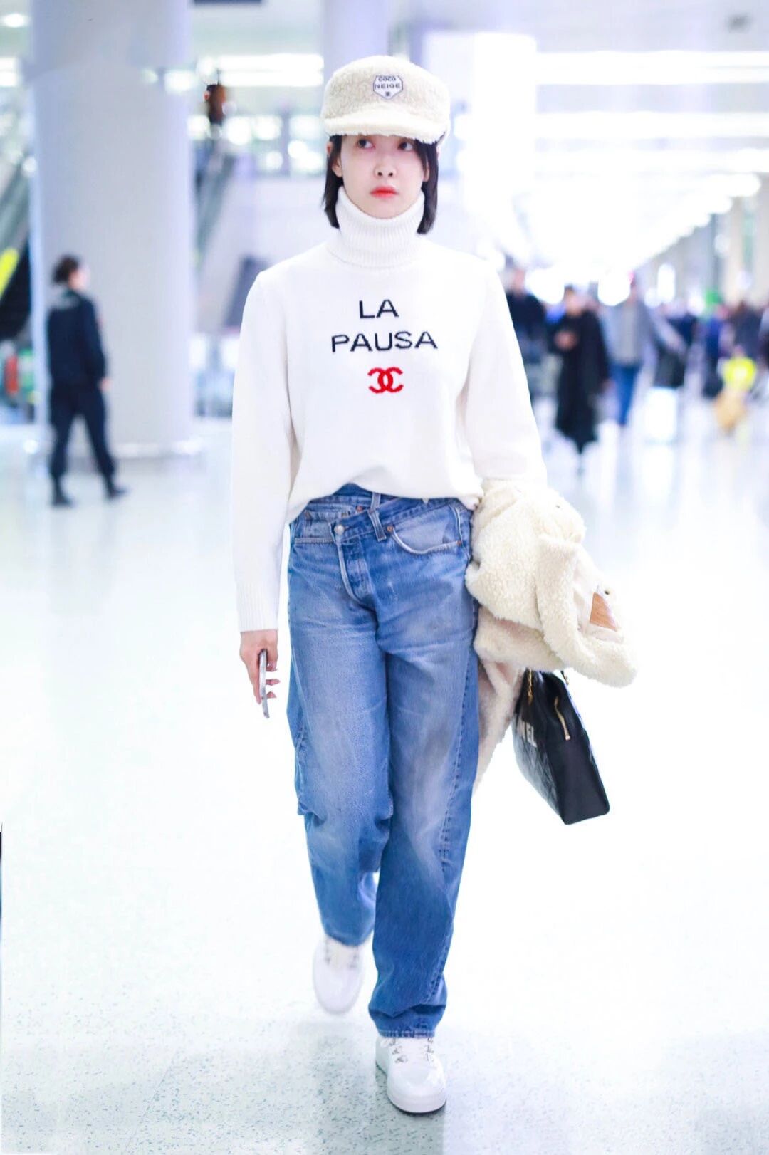 选择短款的更好穿,不会邋遢,正好跟毛茸茸的渔夫帽很match,高腰裤也能拉长比例。