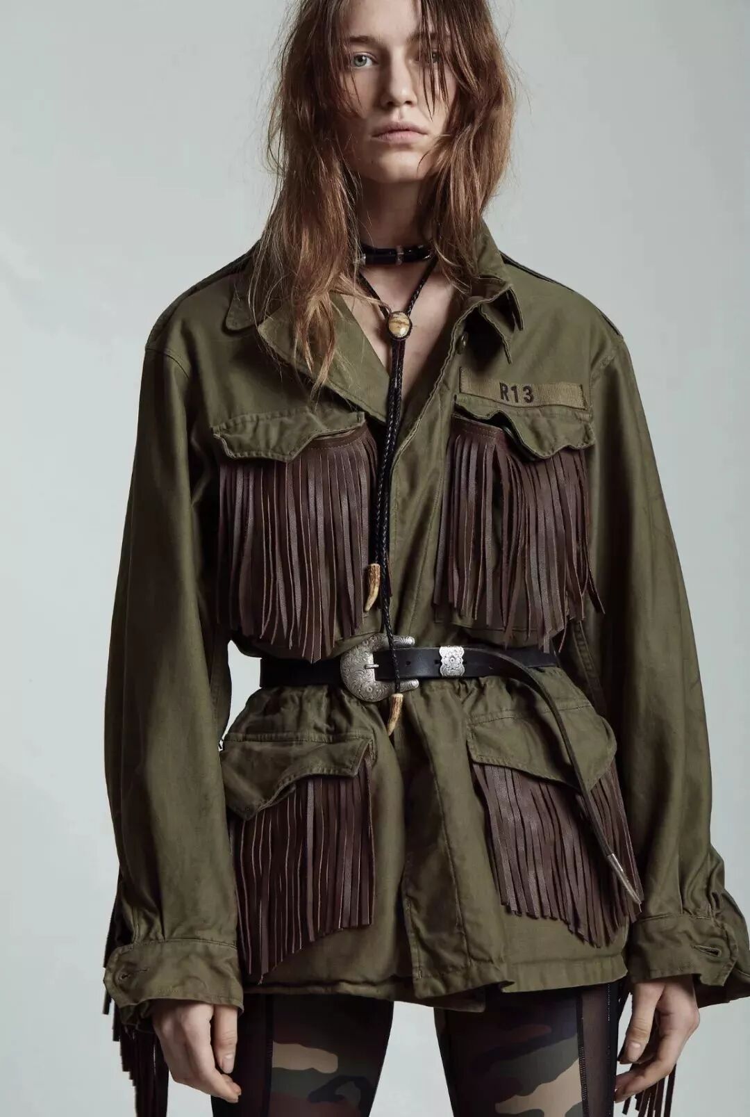 R13的2020早春度假系列也没有忘记Bolo领带。当皮革和银制的印第安小人挂扣相融,即使身穿纱织半裙,利落帅气也丝毫不减。
