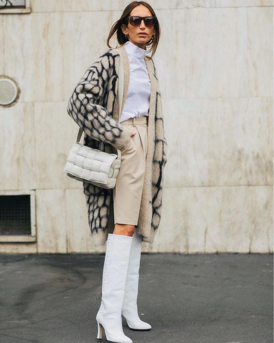 跟白色长靴也是很经典的cp,复古气息满满,又因为中短裤是浅色的,绝对不会太沉闷。