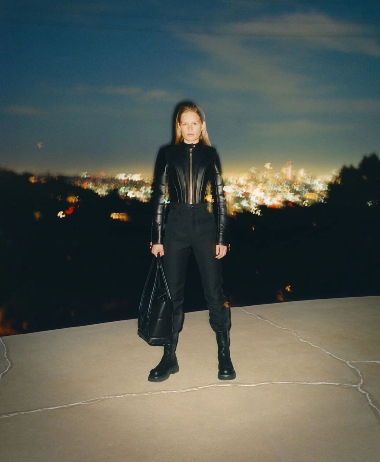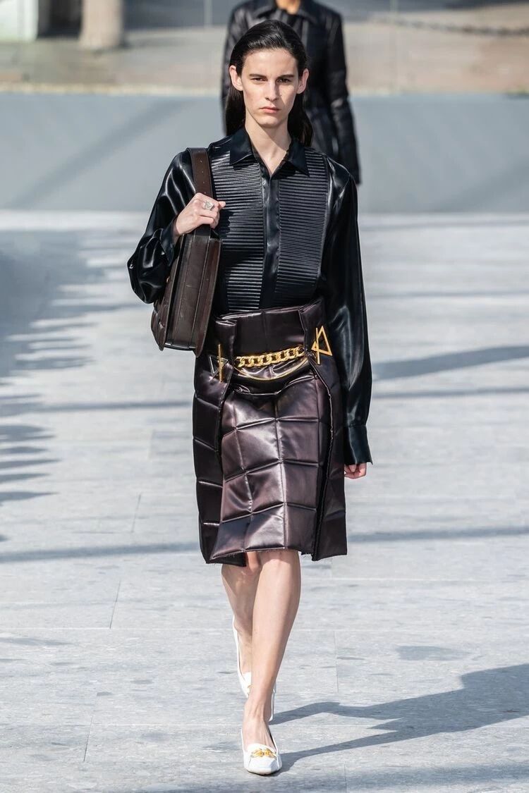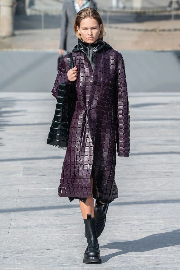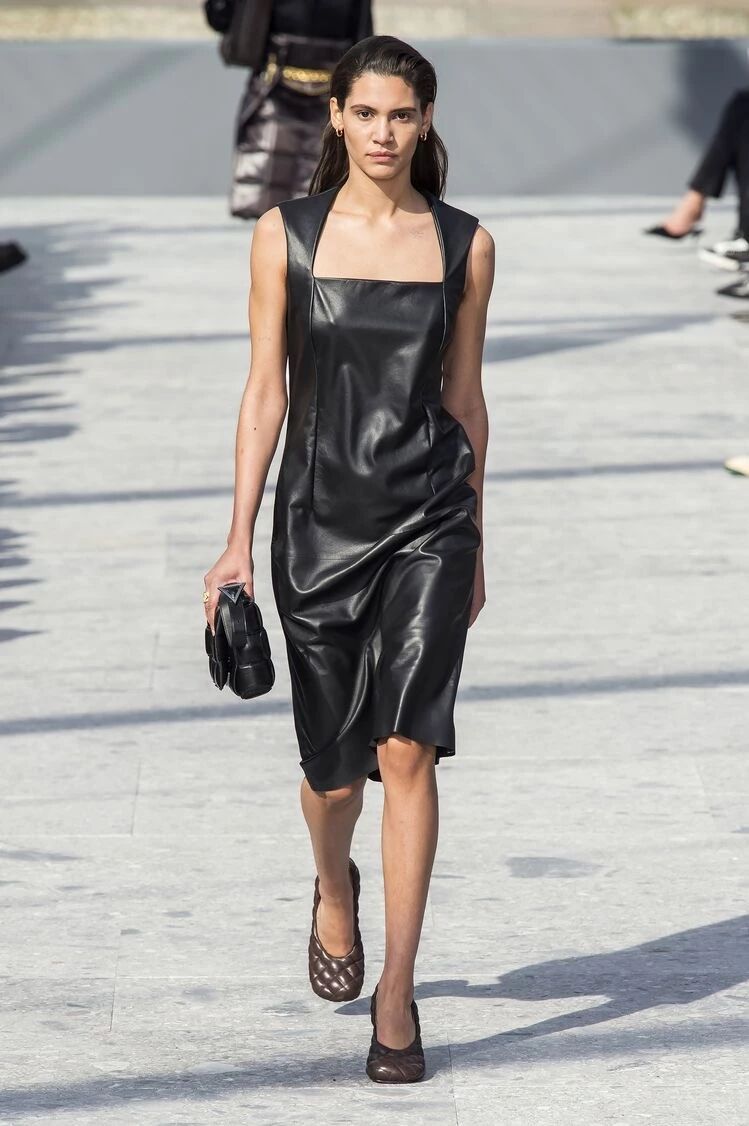 被解构的皮革纹路仿佛铠甲。身着Bottega Veneta的女孩和女人们独立而自信,甚至主动出征。