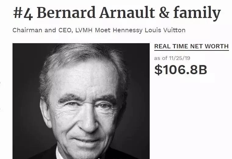 而LVMH的成功,离不开这位 “爸爸” , 也就是集团董事长兼CEO,Bernard Arnault。这匹名利场上的狼,在一次熊市中,迅速的以极低的价格购进了LVMH 43%的股份,成为了第一股东。而后的一系列夺权并购事件,不仅造就了他如今全球仅有的,四位身价过千亿美金的富豪之一,也造就了LVMH这栋无法撼动的奢侈品帝国。