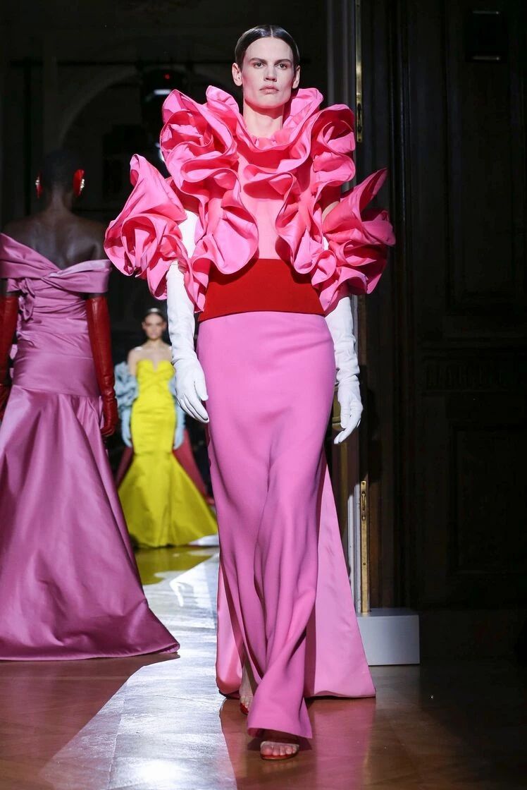 雕塑感是最见高定功力之处,褶皱和荷叶边同样做了夸大处理,将超大的荷叶边设计肩部、还有腰部的点缀,与传统设计大不相同,打造出更加立体的廓形。