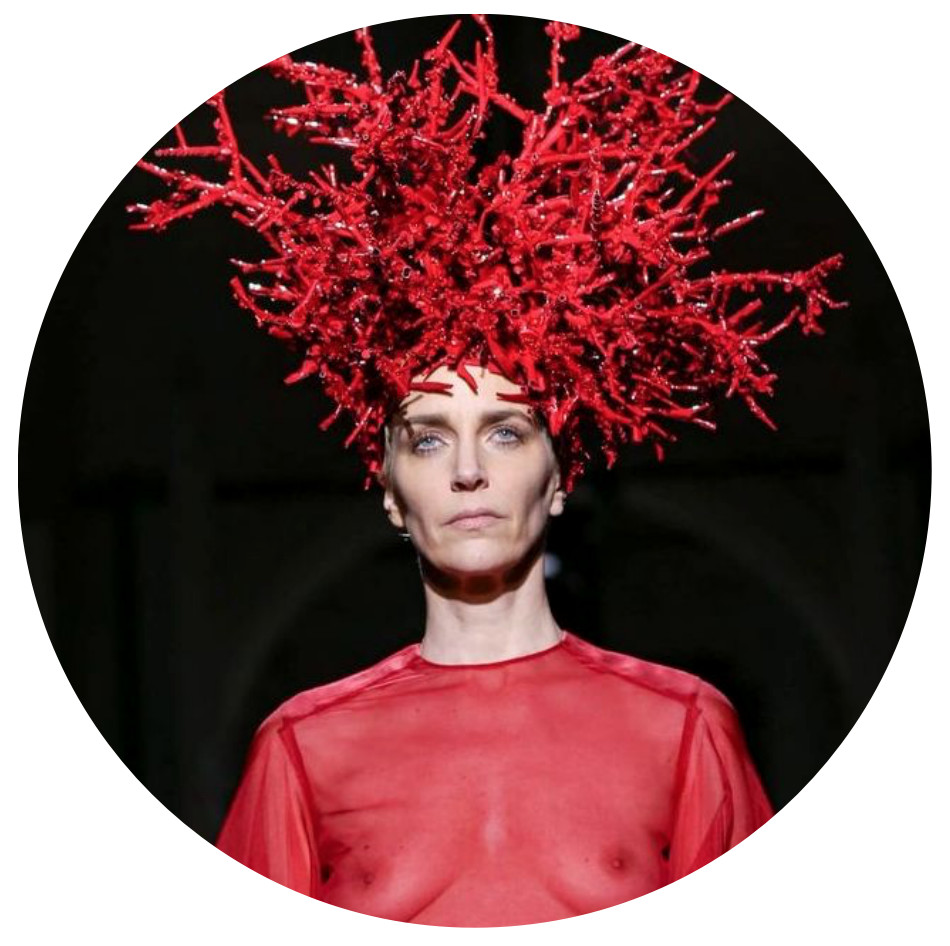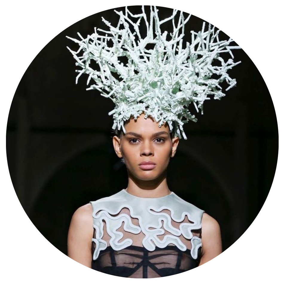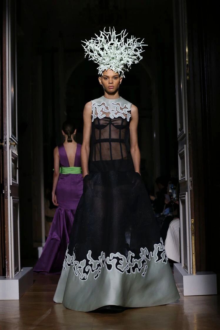 另类的头饰以珊瑚为原型,充满了构造主义的艺术感。和波浪形的印花裙巧妙地组合在一起,给人一种真实的错觉,看起来更加自然。