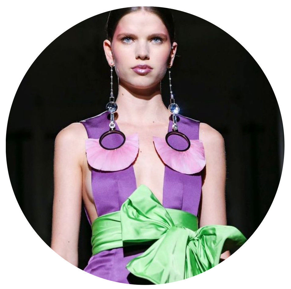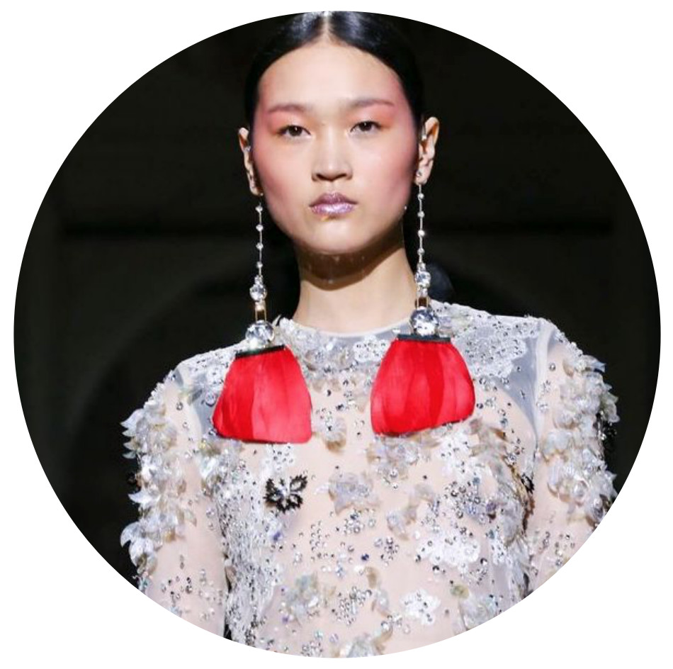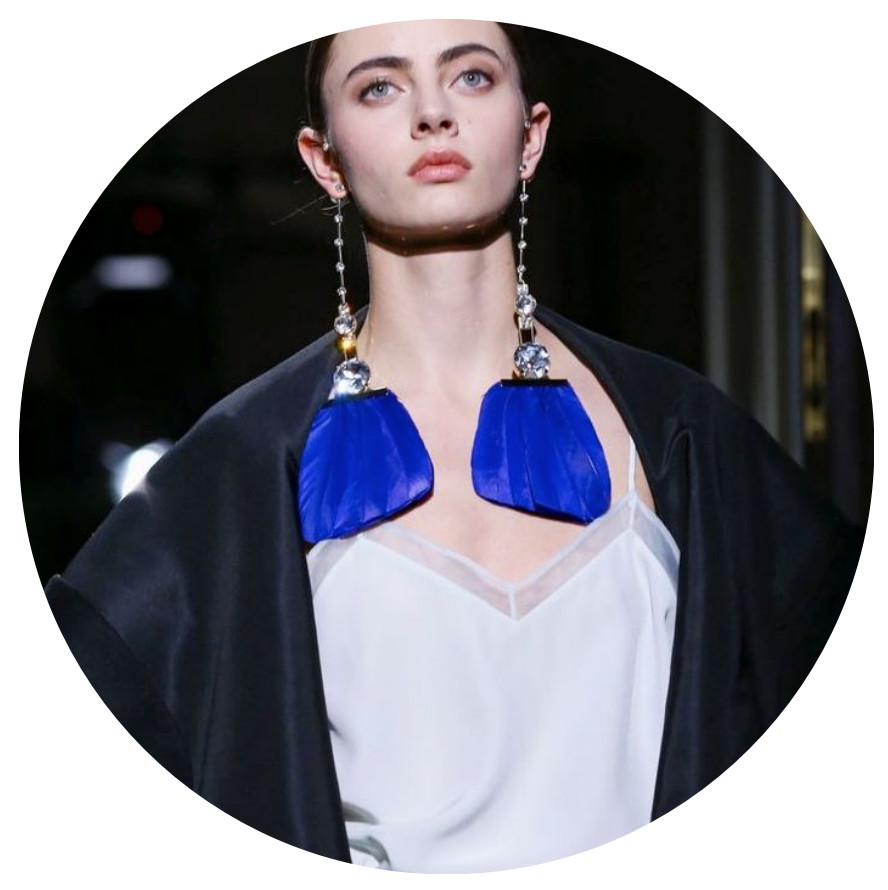 这场大秀的配饰中,最让人注意到的是巨大的羽毛流苏耳环,不规则的几何图案搭配摆式水晶,使羽毛更有质感,与雍容华贵的服饰相得益彰。