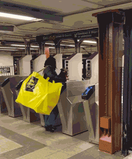 前阵子一条视频在INS上🔥了,博主Nicolas Heller拍到一位女士背着一个超大黄色购物袋进地铁闸门的时候,被,卡,住,了……
