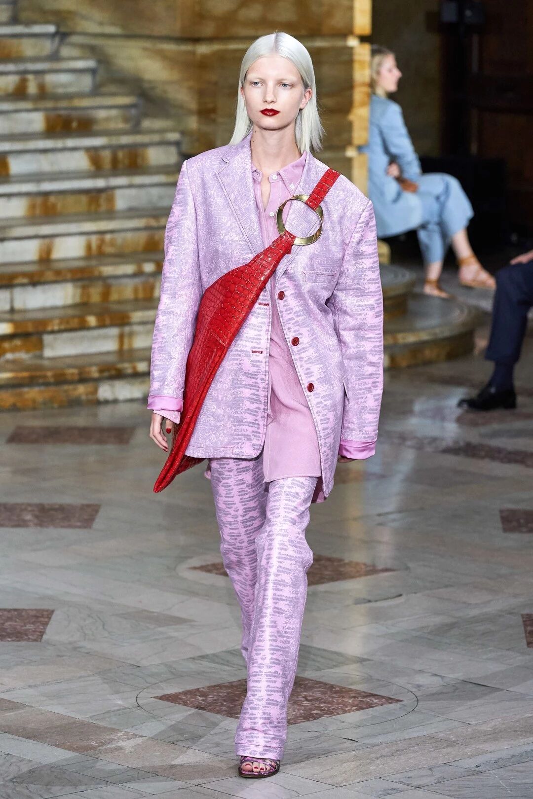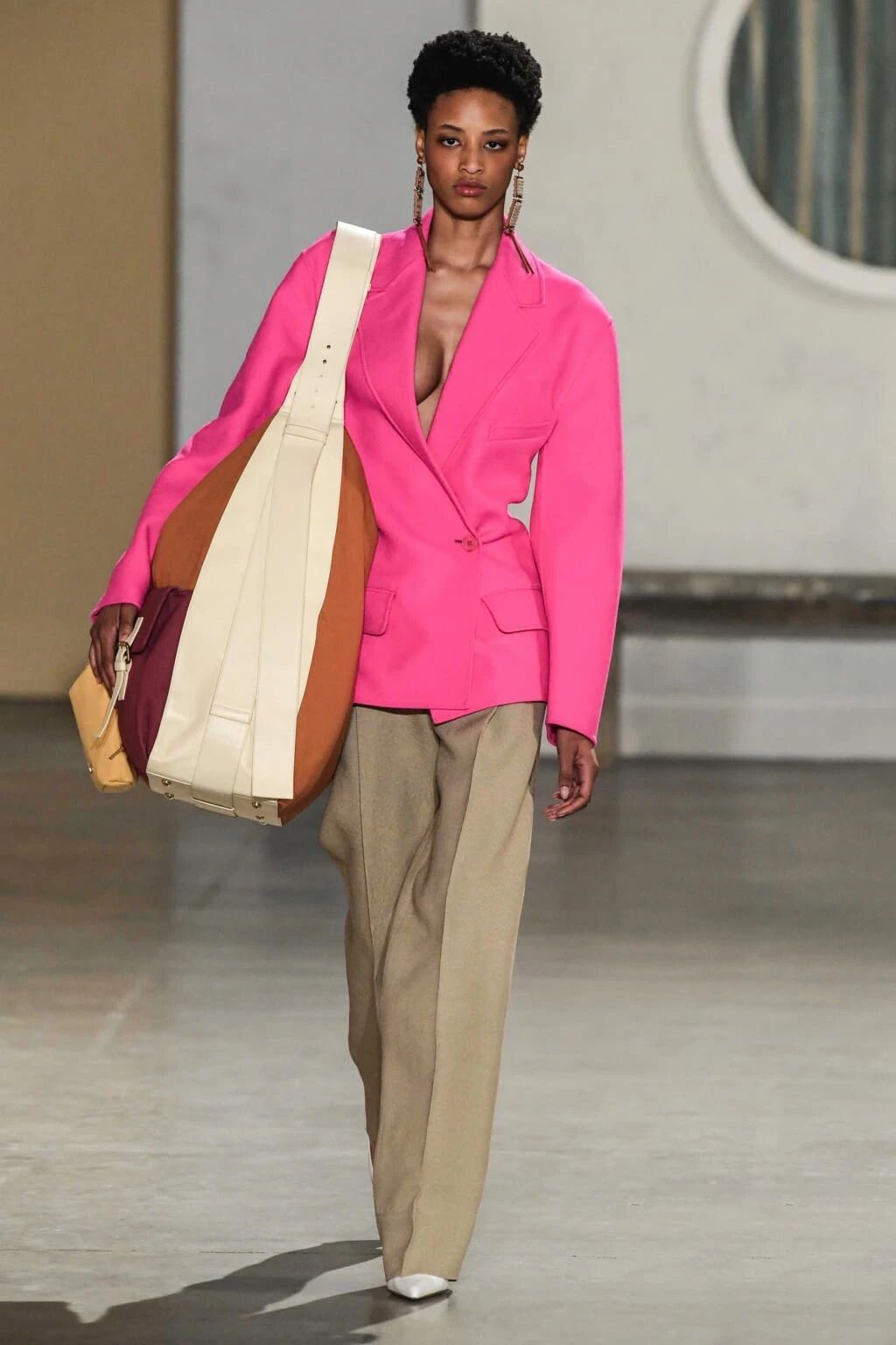 今年模特们还有一种还很流行的背法 —— 只背一边肩带。