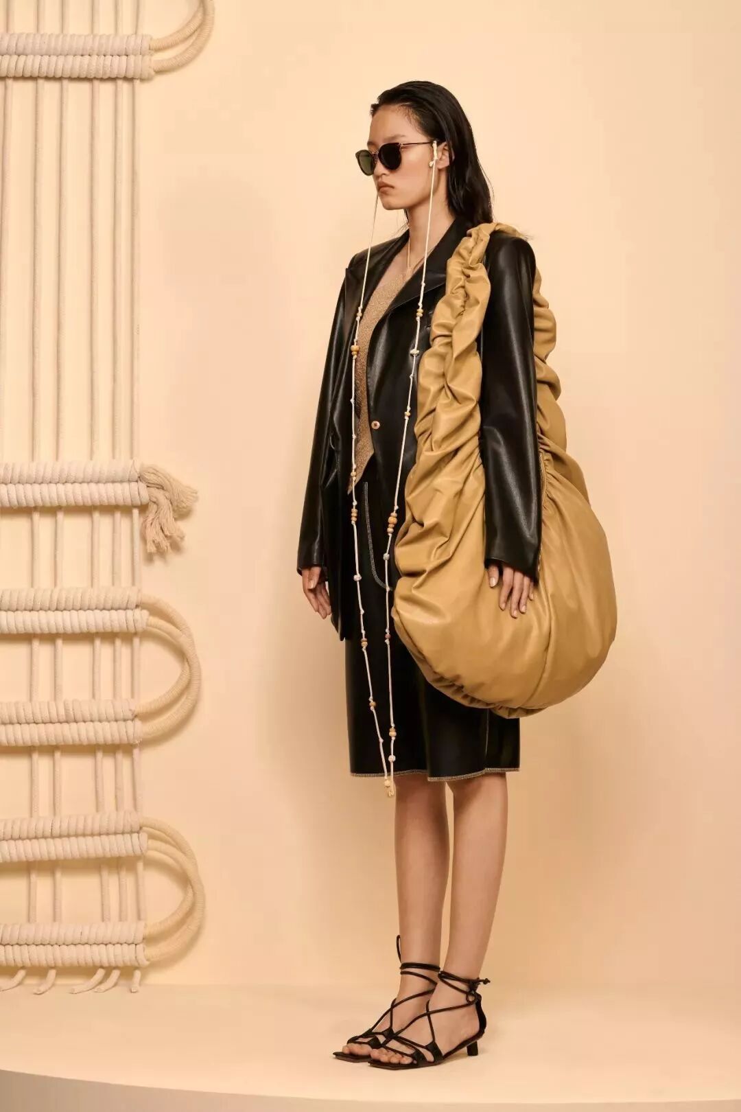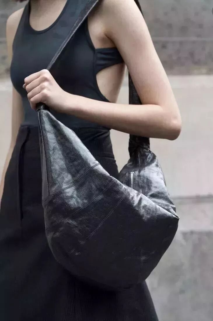 软皮料材质,宽厚减压的肩带,廓形松散流动,设计轻盈,居然可以和衣服融为一体。