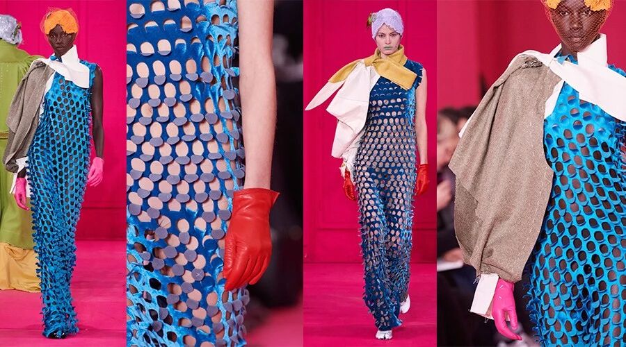 超现实主义的代表Schiaparelli,则用天马行空的想象与精巧的细节,将蓝色流畅的贯穿于本季的秀场之中:抢眼的花朵耳饰、珠光宝气的礼服裙……忽明忽暗、忽强忽弱,宣告气势却不喧宾夺主,让每件礼服都如雕塑般隽永。