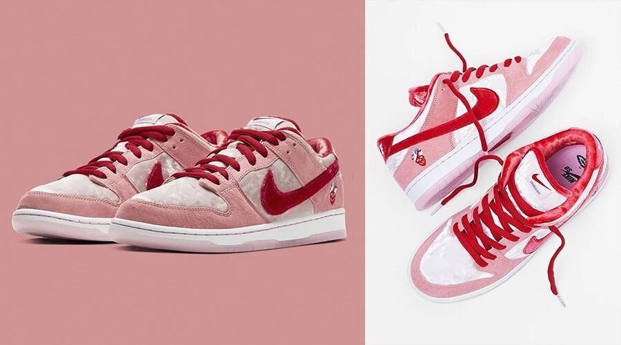 在鞋圈热度颇高的Nike SB Dunk Low,除了此前引起轰动的Travis Scott联名系列,赶在节前上架的StrangeLove情人节限定,才是绝对的吸睛。当粉红麂皮遇上银白色的天鹅绒,配以通透的淡粉色果冻鞋底,再加上以刺绣形式呈现于鞋跟的StrangeLove标志性骷髅头,每个细节都值得推敲。