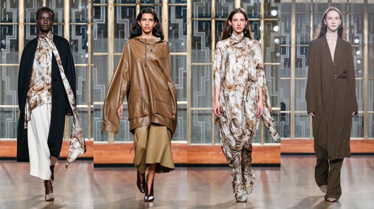 女装系列首次登上秀场的Petar Petrov ,展示了极具细节主义的裁剪,极强的领部飘带是气场来源,Oversize皮衣有种不屑一顾的酷感,被放大的袖子,又将飘逸裙装变得更加趣味显眼,而柔和的灰棕色调塑造了舒适轻松的感受,创造了流动的优雅。