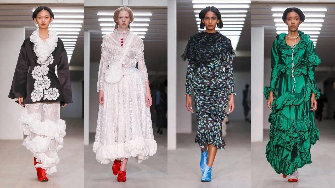 Yuhan Wang以维多利亚时期,女性为自己提前准备好的葬礼服饰为灵感,带来了在伦敦时装周的首秀,系列中没有哀悼的暗示,只有买好的荷叶边与蕾丝材质,和充满庄重的女性风格;尖头平底鞋尽管被毛绒覆盖,也有着坚韧的气质;这些乐观又强大的精神,在当下更显珍贵